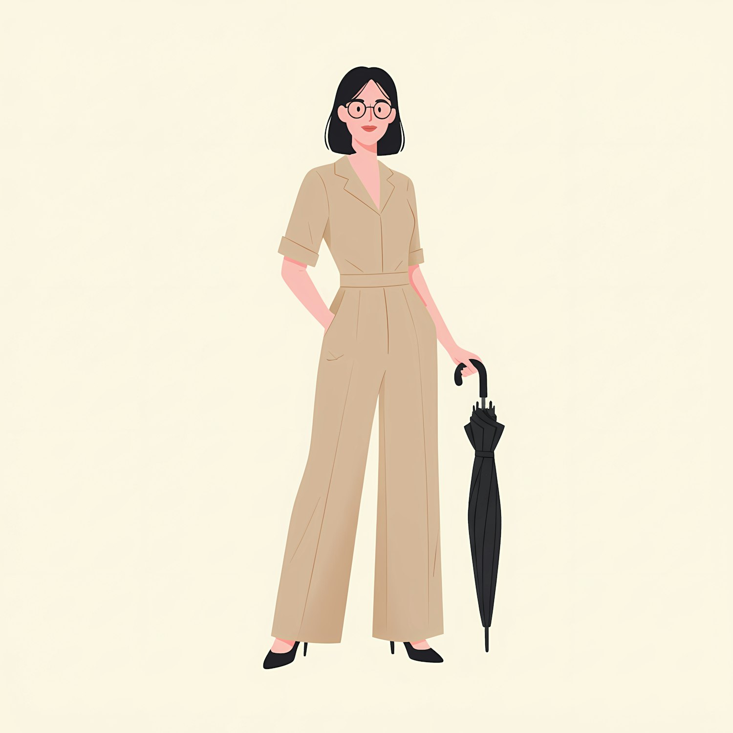 Minimalist illustration of a stylish woman in a beige jumpsuit holding a black umbrella, set against a light beige background.