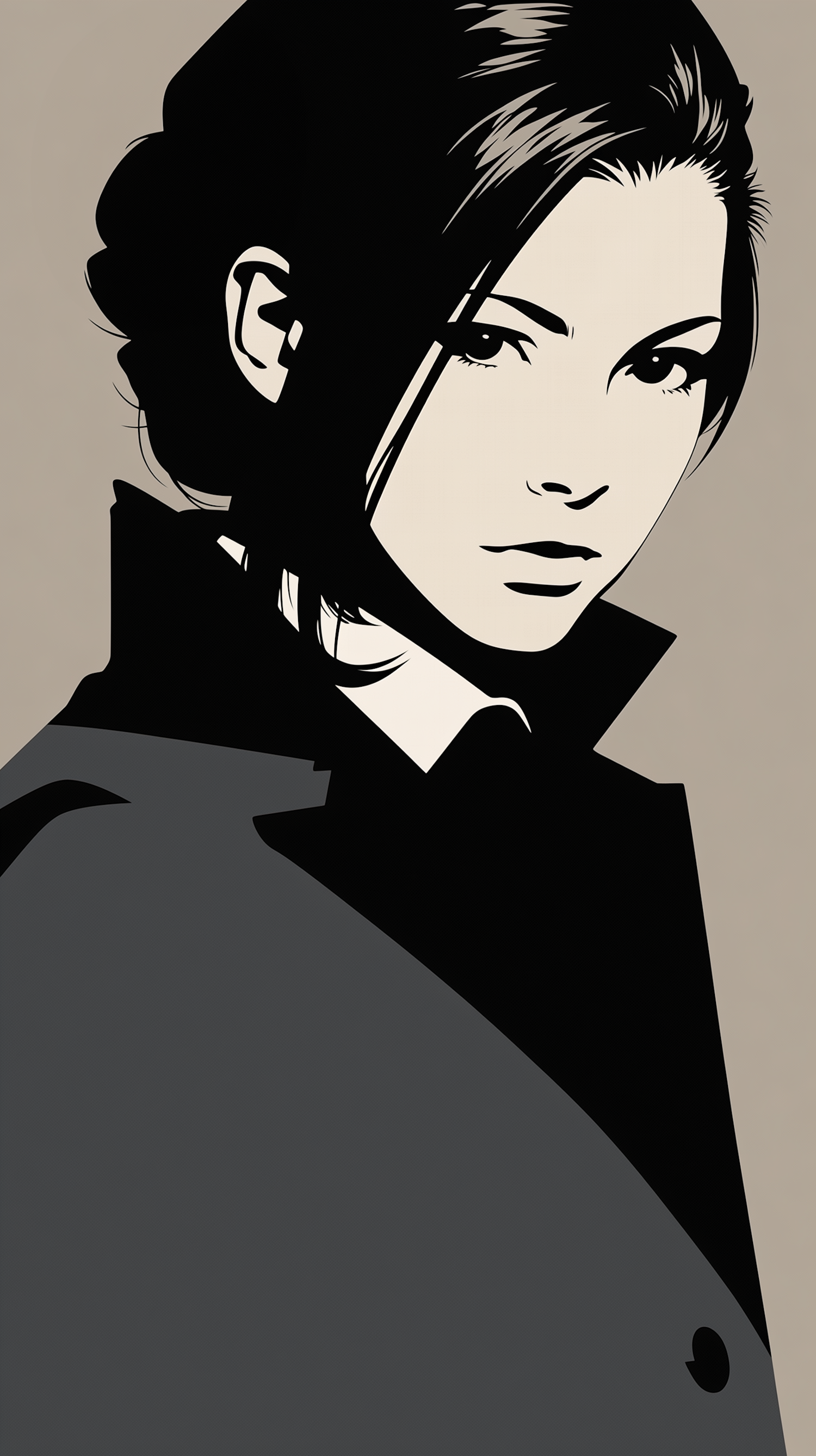 Minimalist illustration of a woman in a high-collared coat, featuring bold lines and a high-contrast black and beige color scheme.