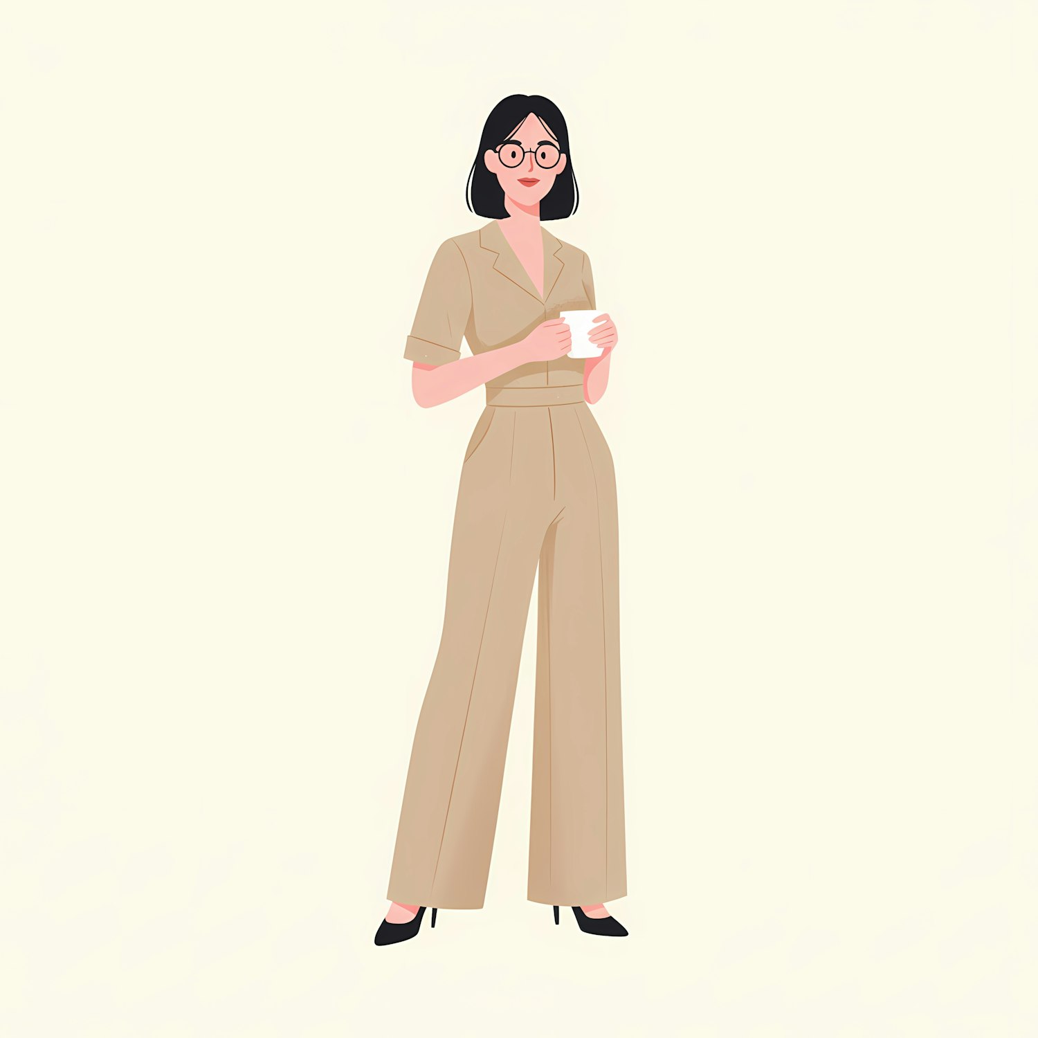 Minimalist illustration of a woman in a beige jumpsuit holding a cup, with short black hair and glasses, standing against a light background.