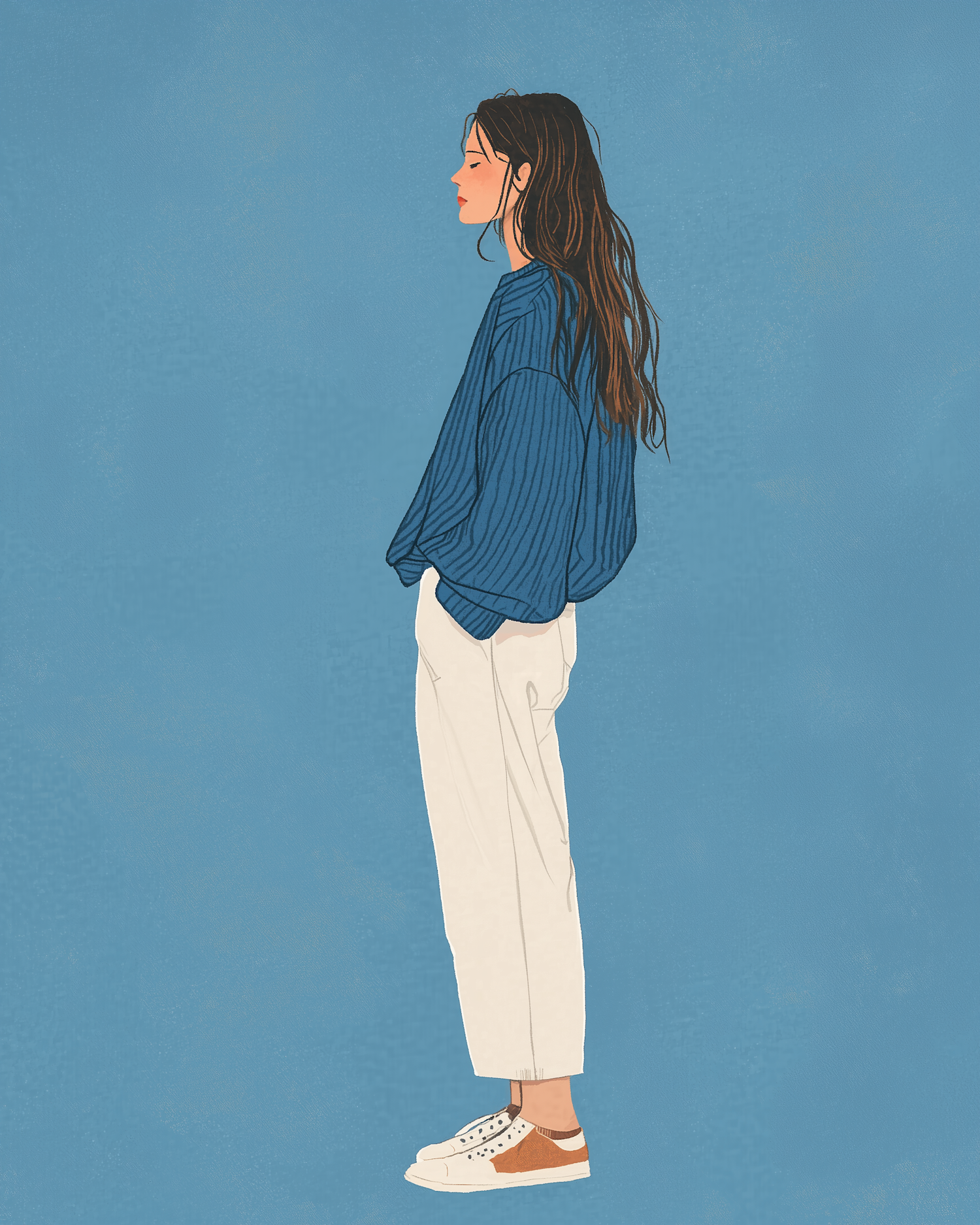 Minimalist illustration of a woman in a blue sweater, white pants, and sneakers, standing in profile against a solid blue background.