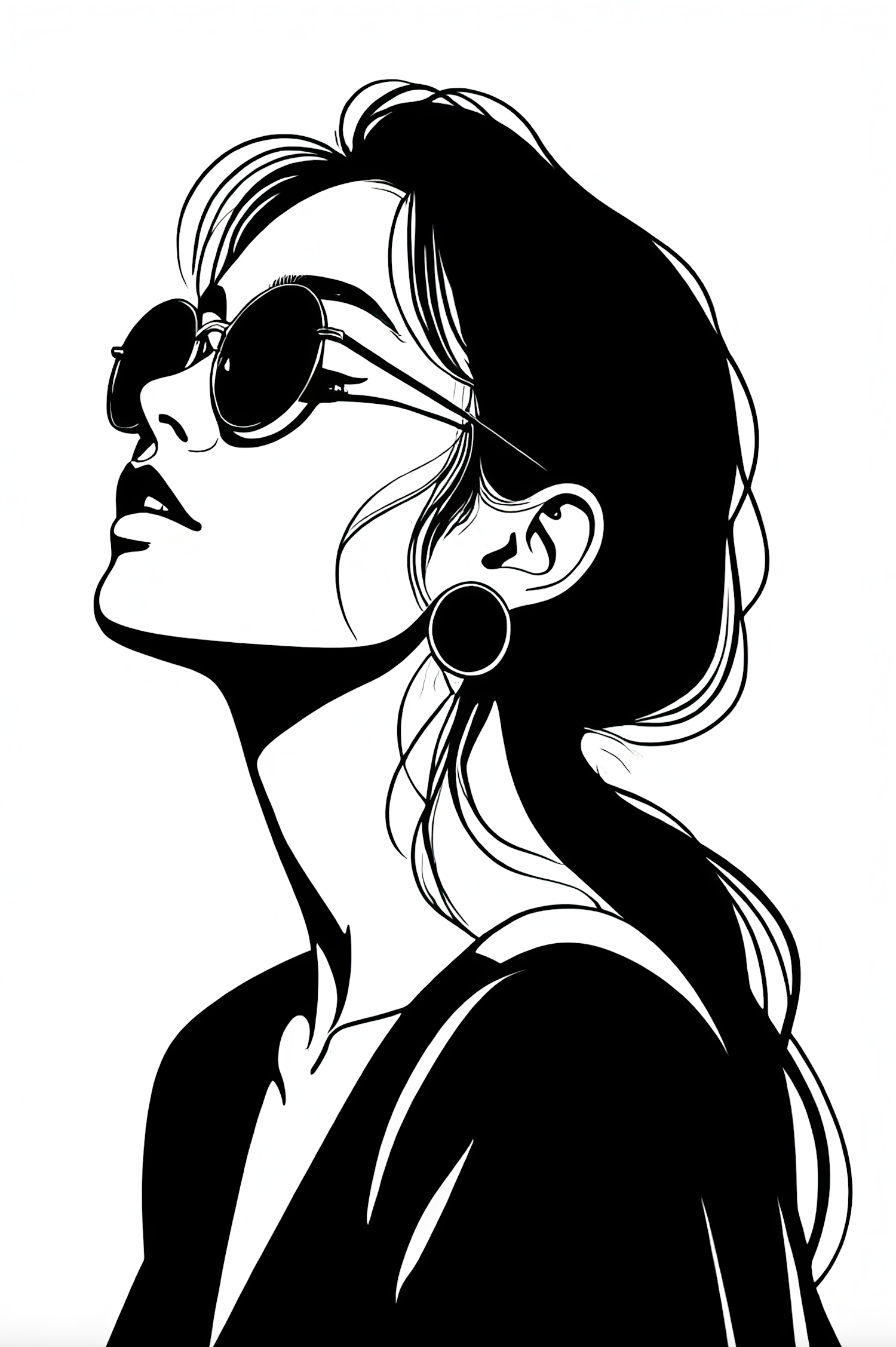 Minimalist black-and-white illustration of a woman in sunglasses and earrings, looking upward with a sleek and modern aesthetic.