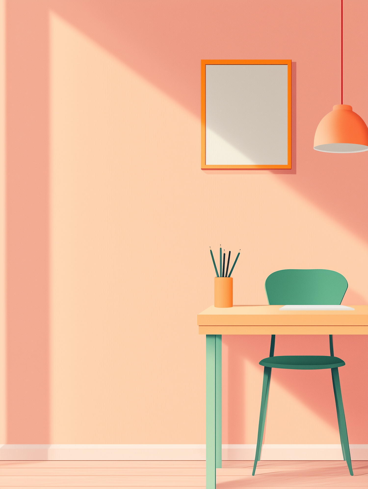 Minimalist room with pastel colors, featuring a desk, chair, mirror, and pendant lamp. Soft peach and mint green tones create a cozy vibe.