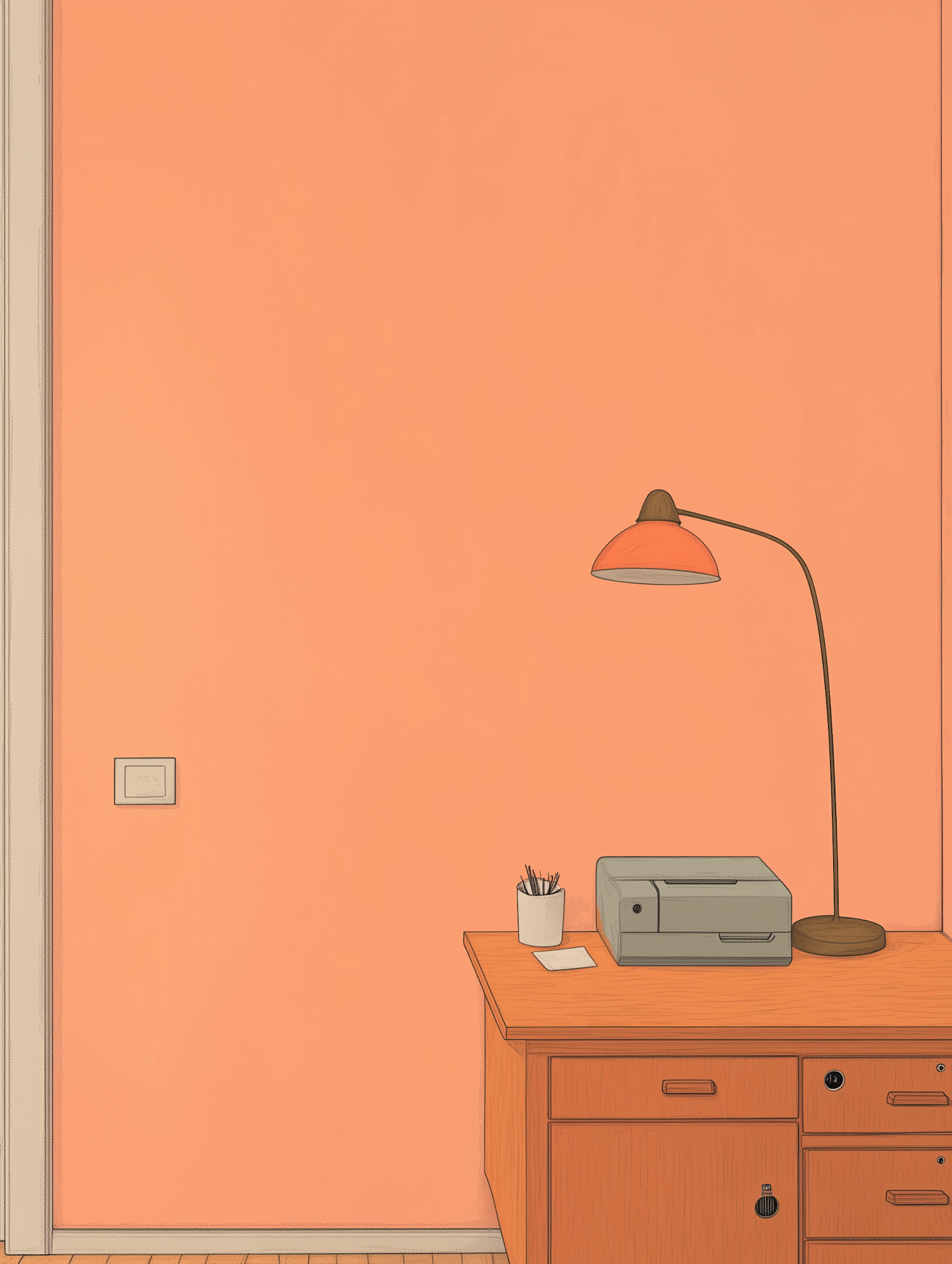 Minimalist office scene with a peach wall, wooden desk, gray printer, and orange desk lamp. Warm and inviting workspace.