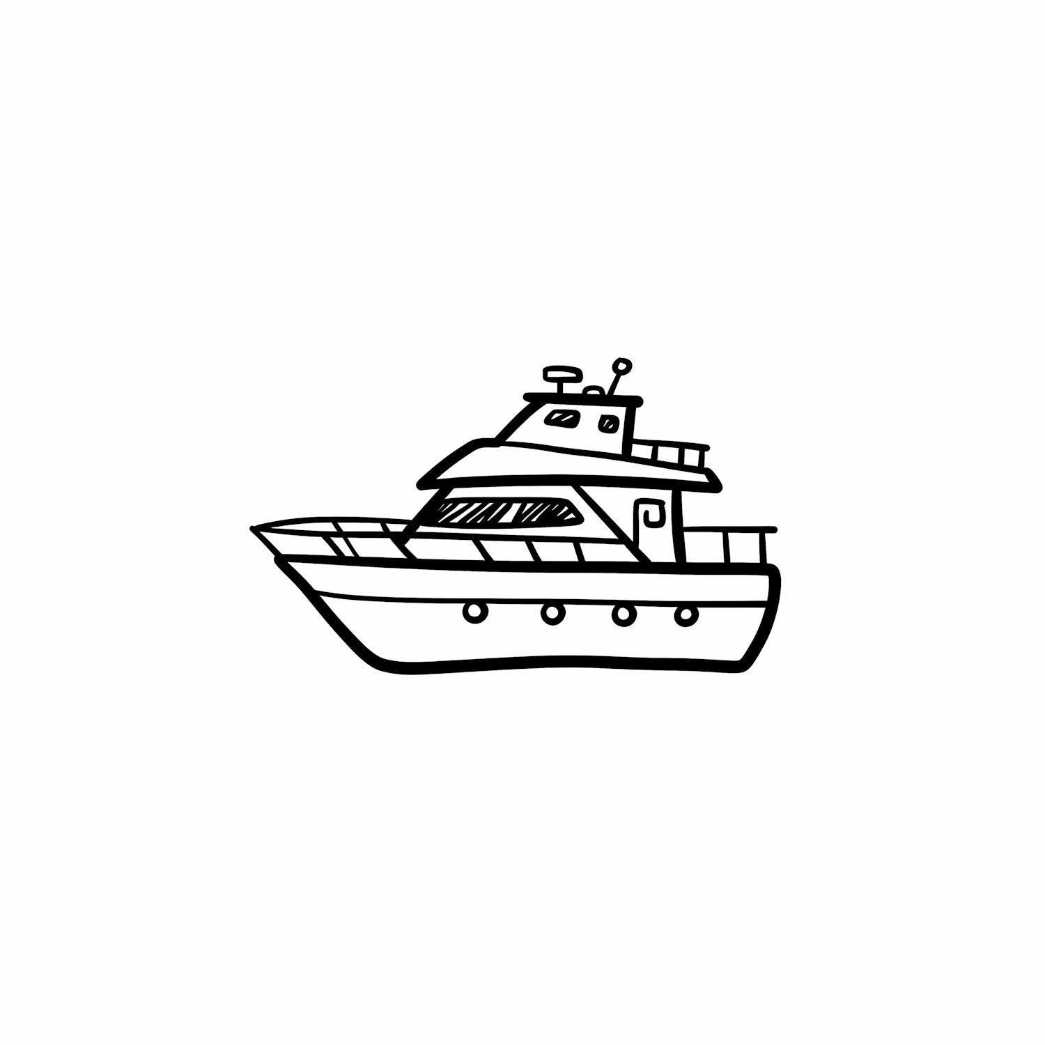 Minimalistic black-and-white line drawing of a yacht with clean lines and simple details, perfect for nautical-themed designs.