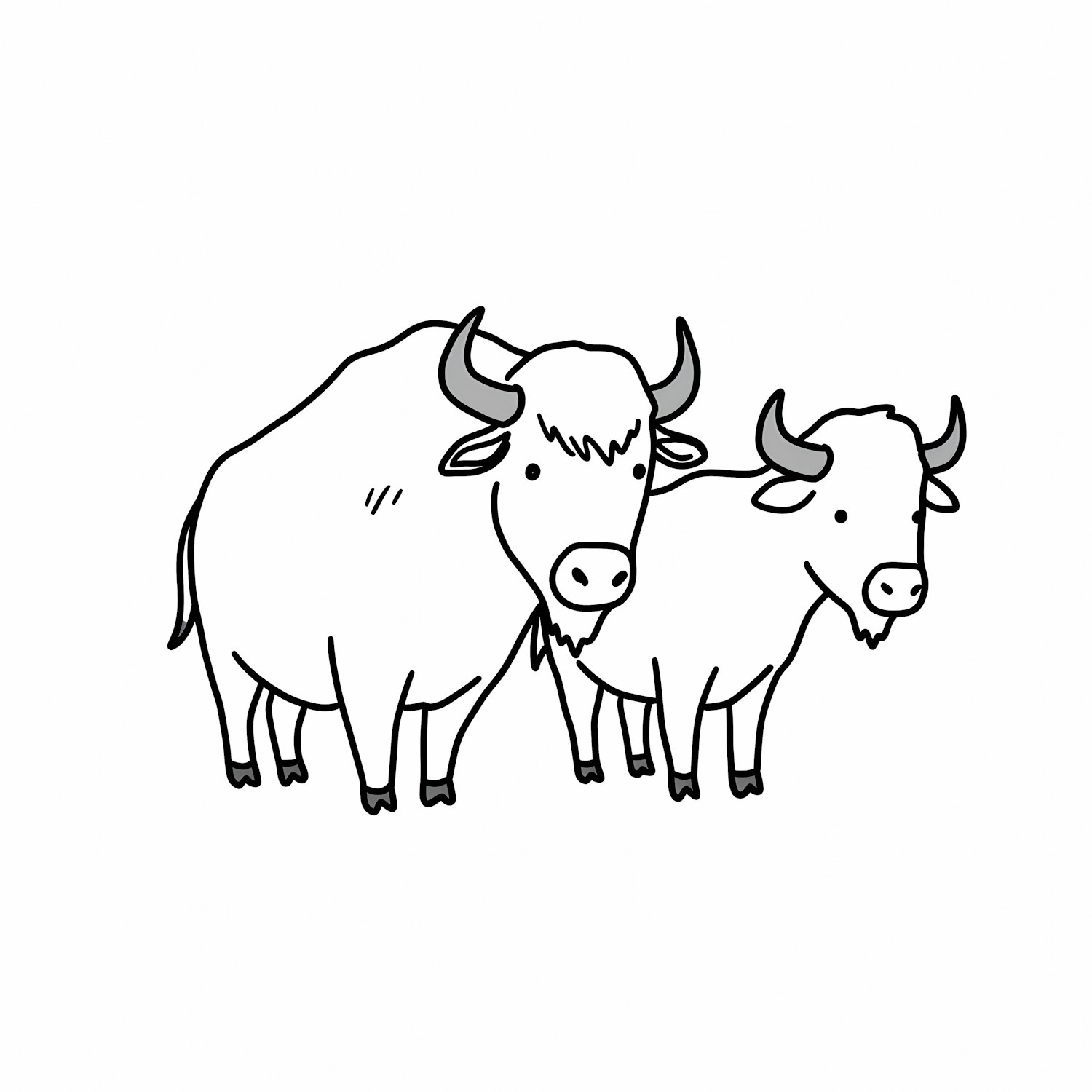Minimalistic black-and-white line art of two yaks standing together, showcasing their curved horns and calm expressions.