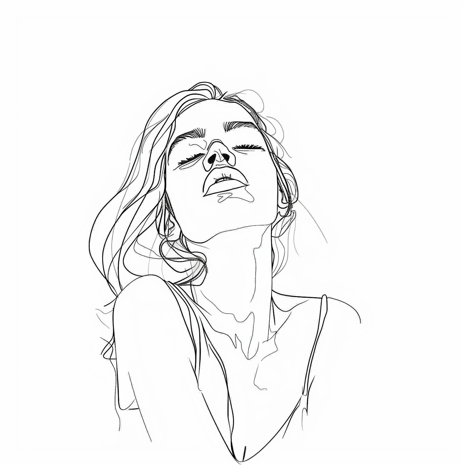 Minimalist line drawing of a serene woman with closed eyes and flowing hair, capturing elegance and calmness.