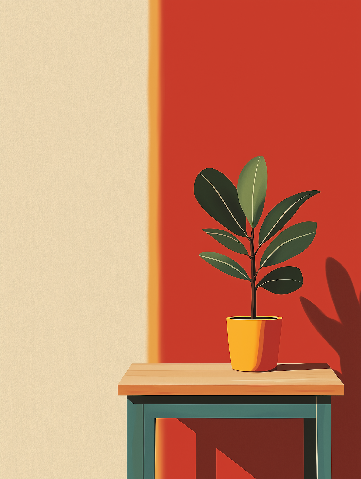 Minimalist illustration of a green plant in a yellow pot on a wooden table against a beige and orange background.