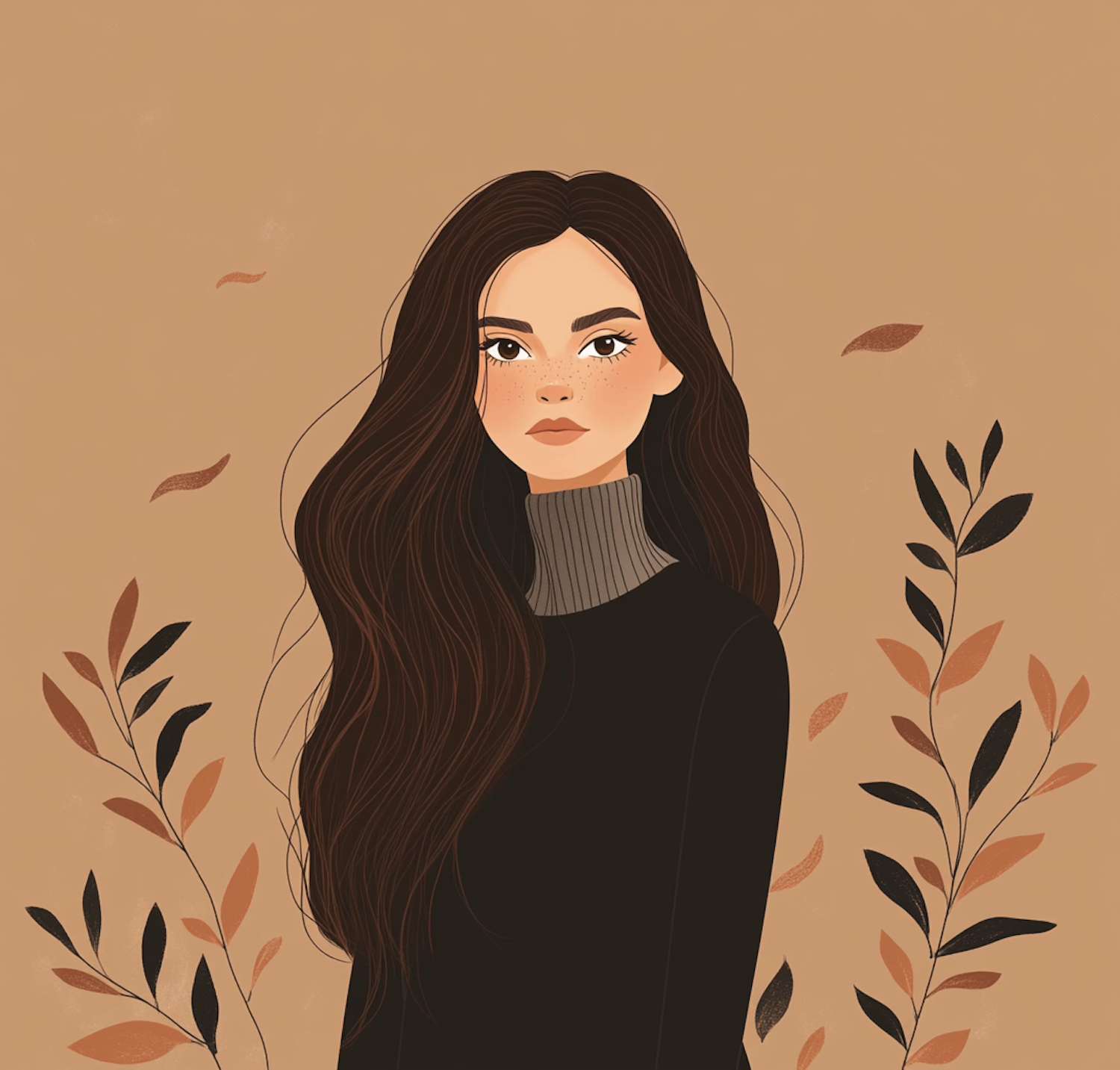 Illustration of a woman with long dark hair, wearing a dark sweater, set against a beige background with autumn leaves.
