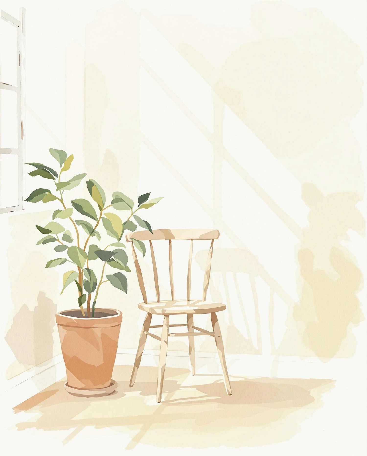 A watercolor painting of a minimalist interior, wooden chair, terracotta plant pot, sunlight on white walls, soft brush strokes, warm neutral tones
