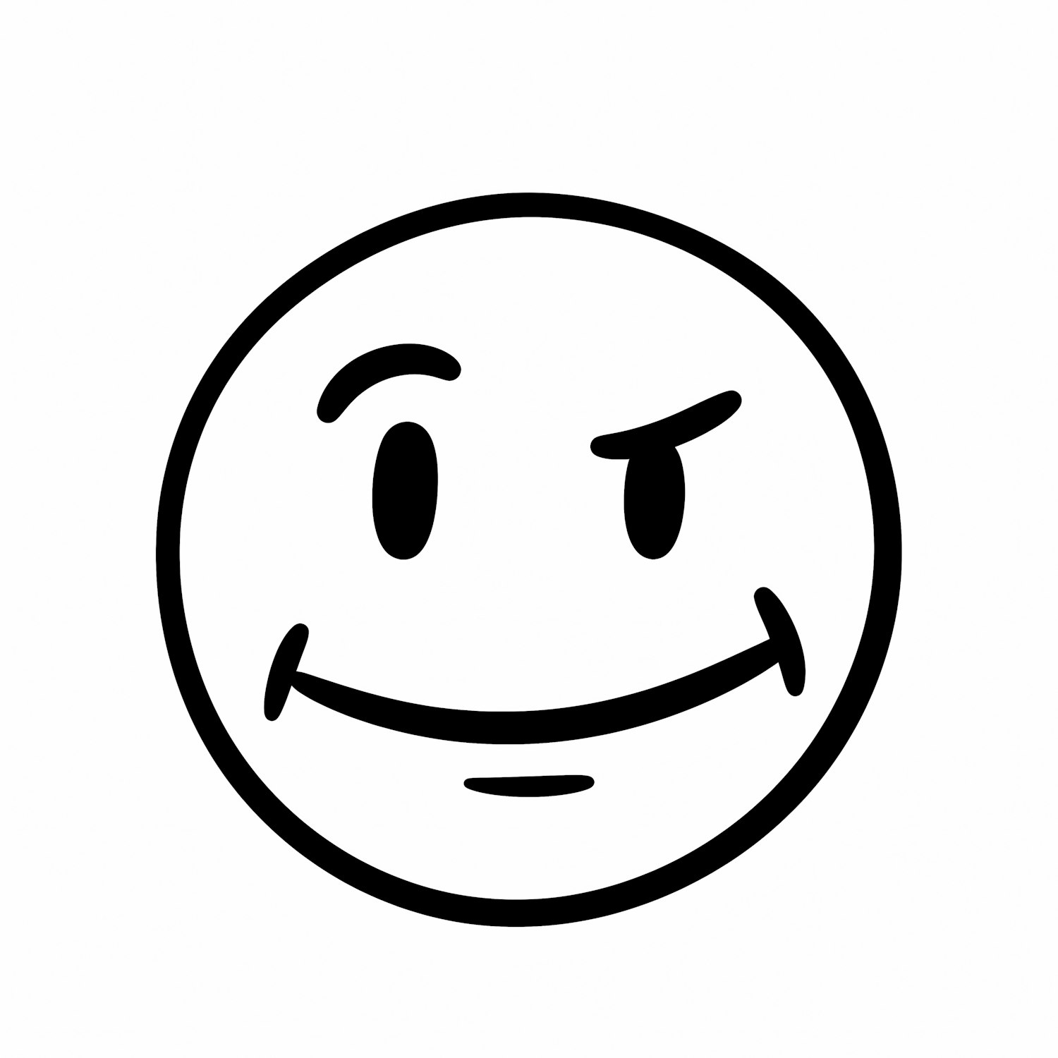 A black and white mischievous smiley face illustration with a raised eyebrow and a smirk, set against a plain white background.