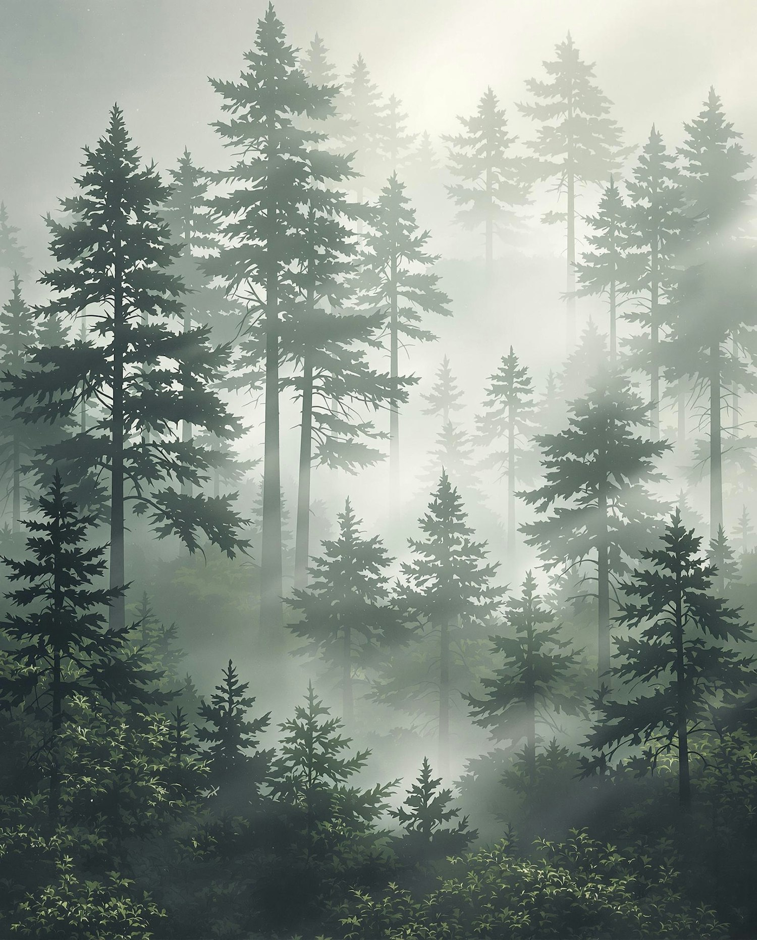 Ethereal fog envelopes tall evergreen trees in a serene forest; lush greenery grounds the mysterious and peaceful ambiance.