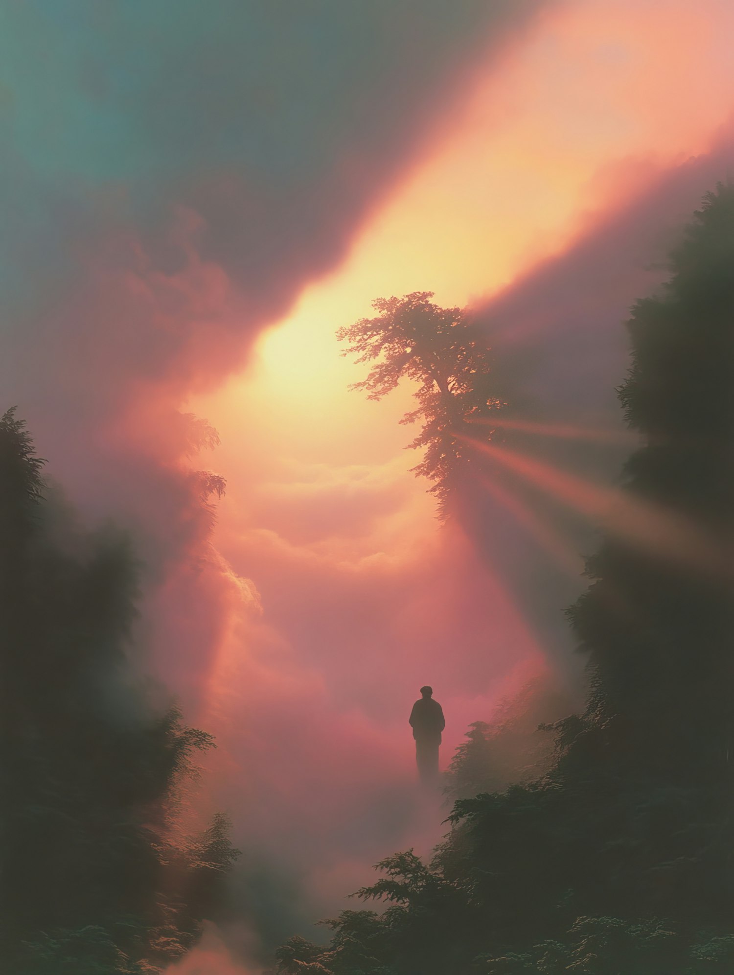 A lone figure stands in a misty forest, silhouetted against a glowing sky with dramatic sunlight piercing through clouds.