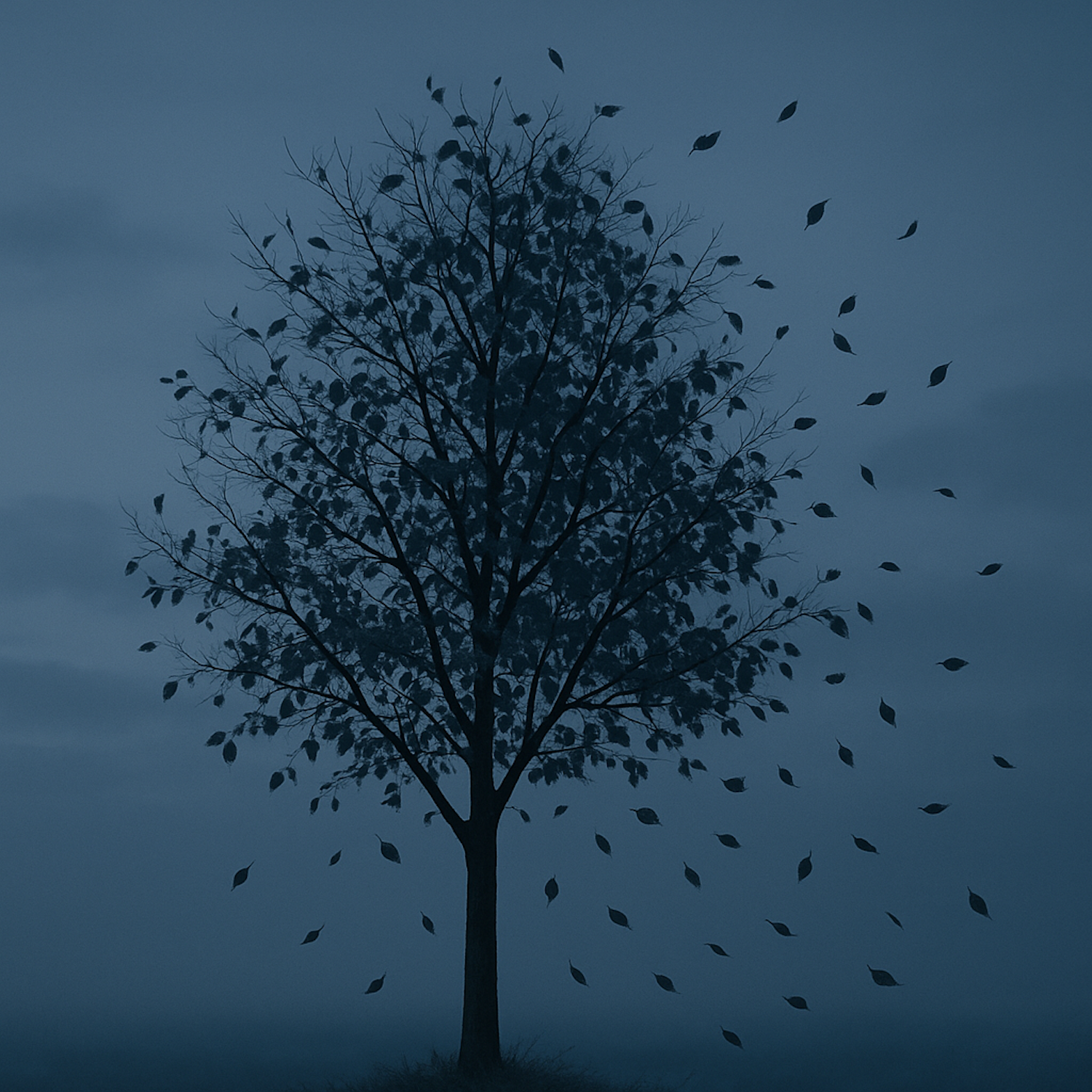 A serene image of a silhouetted tree in twilight, with leaves swirling gently away. The mist adds a melancholic yet peaceful backdrop.