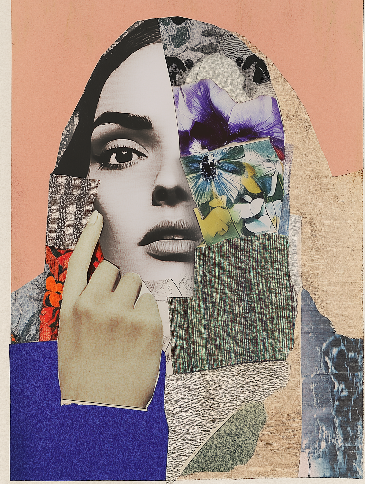 A vibrant mixed-media collage of a woman's face, combining photographic elements, floral patterns, and textured fabrics on a peach background.