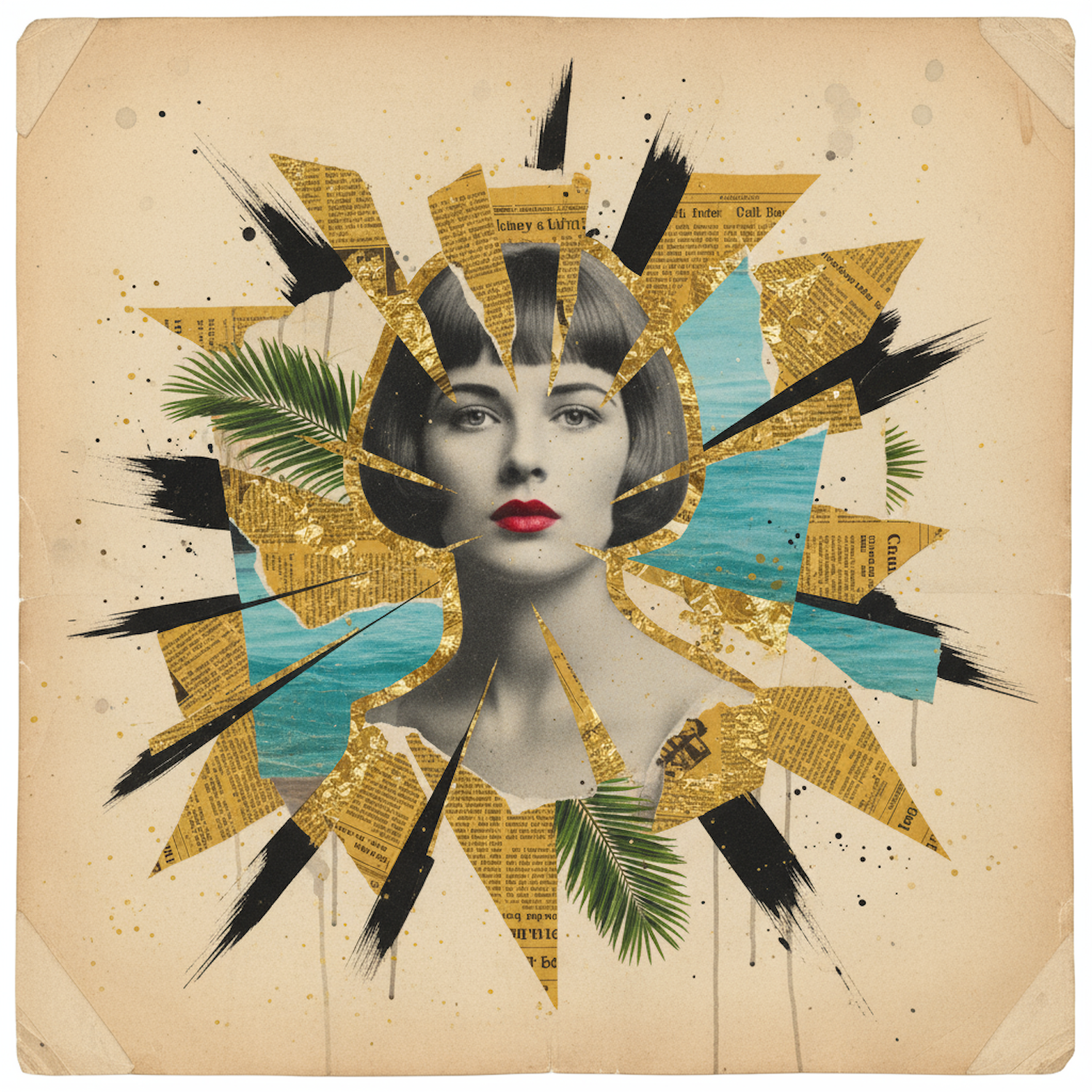 A striking mixed-media artwork combining a grayscale portrait, gold leaf, and vibrant painted elements for a vintage-modern aesthetic.