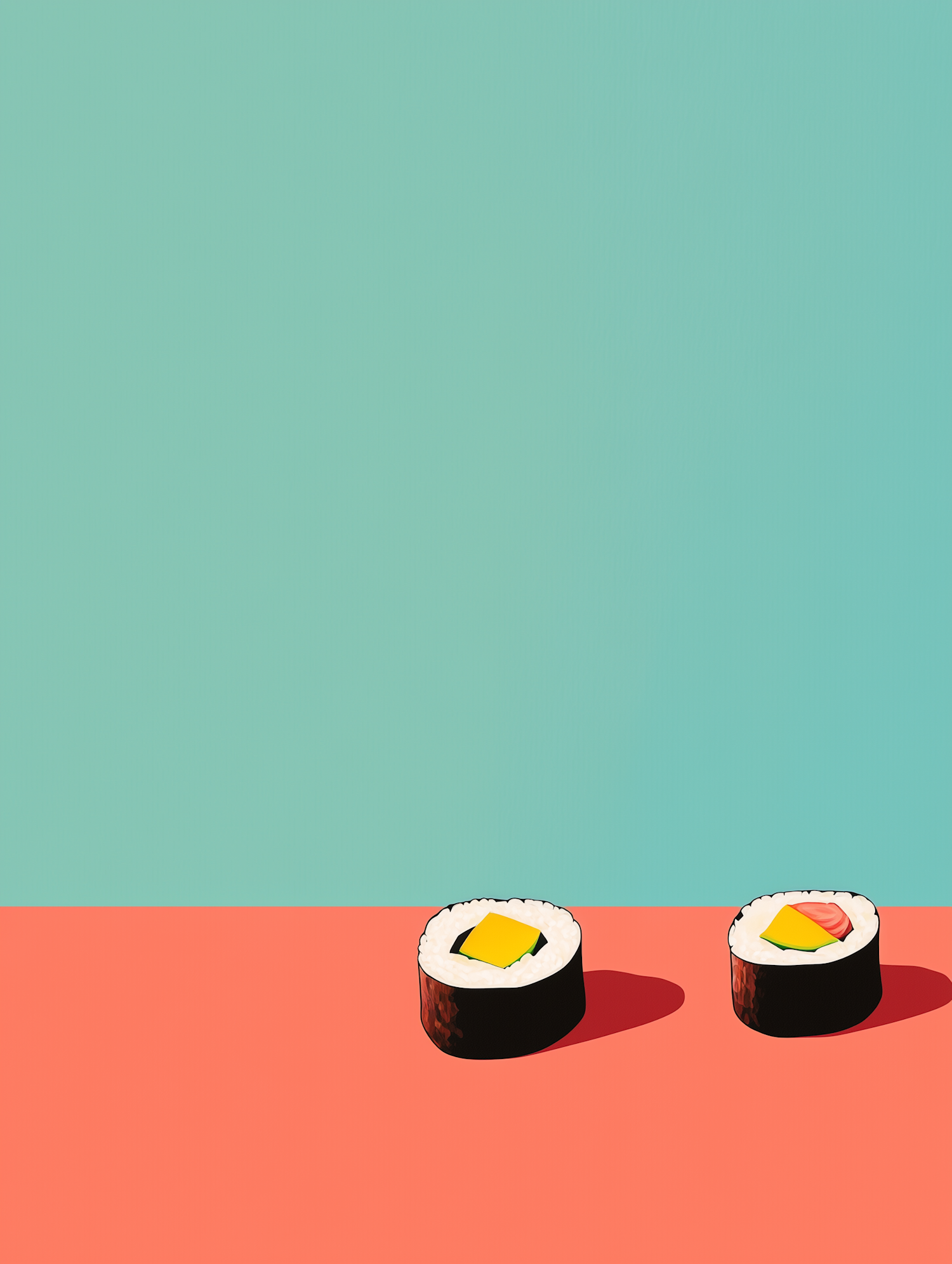 Minimalist sushi art with two rolls on a coral surface against a teal background. Bright colors and clean lines create a modern aesthetic.