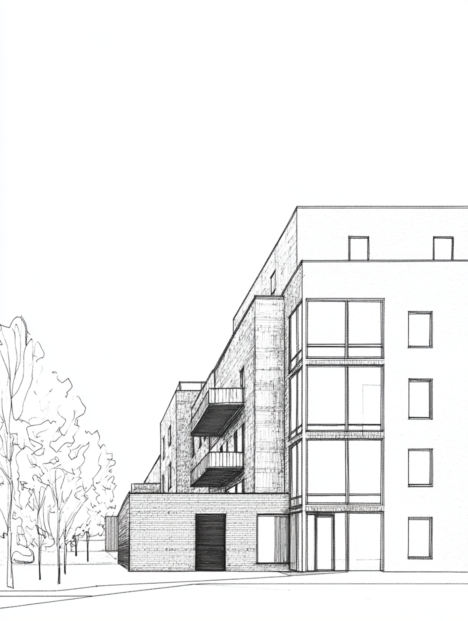 Architectural illustration of a modern building with brick and glass facade, featuring balconies and stylized trees.