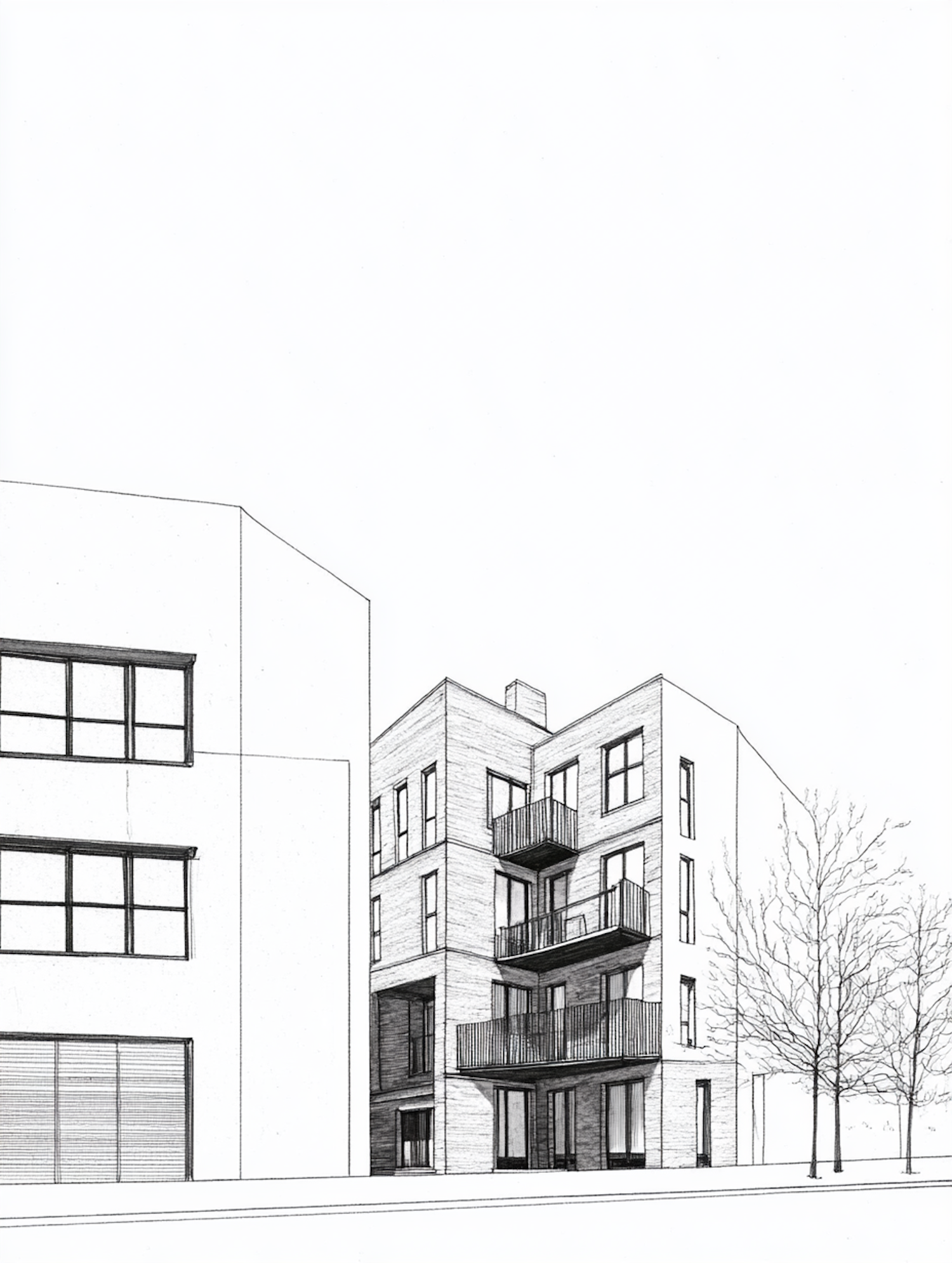 Black and white architectural illustration of a modern building with balconies and adjacent structures, featuring leafless trees.
