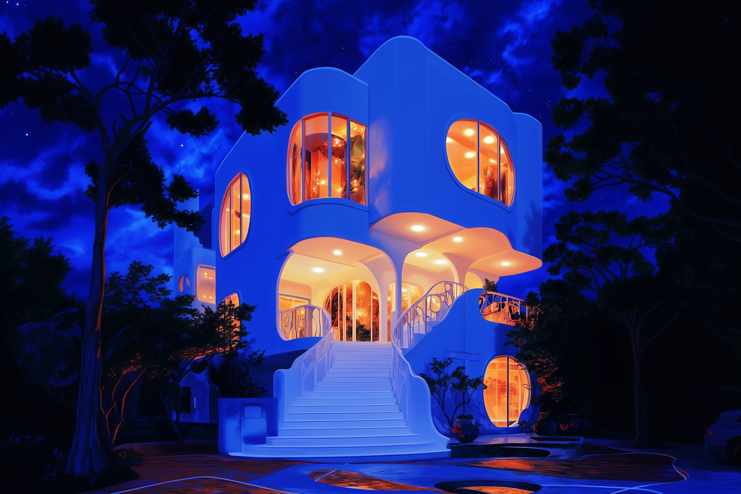 Futuristic white house with glowing windows against a starry night sky, featuring a grand staircase and elegant design.