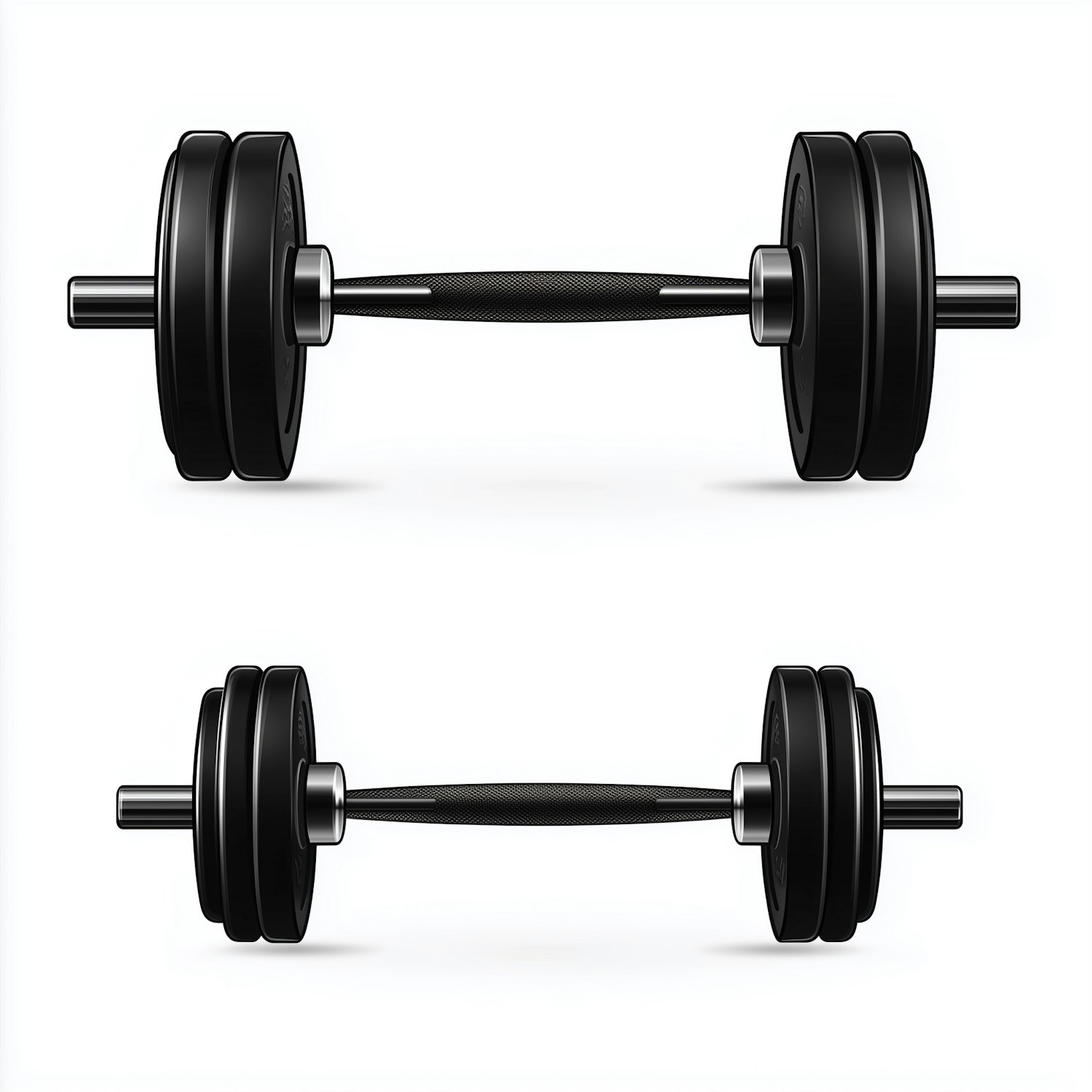Sleek black dumbbells with textured grips and circular weights, perfect for strength training. Clean design on a white background.