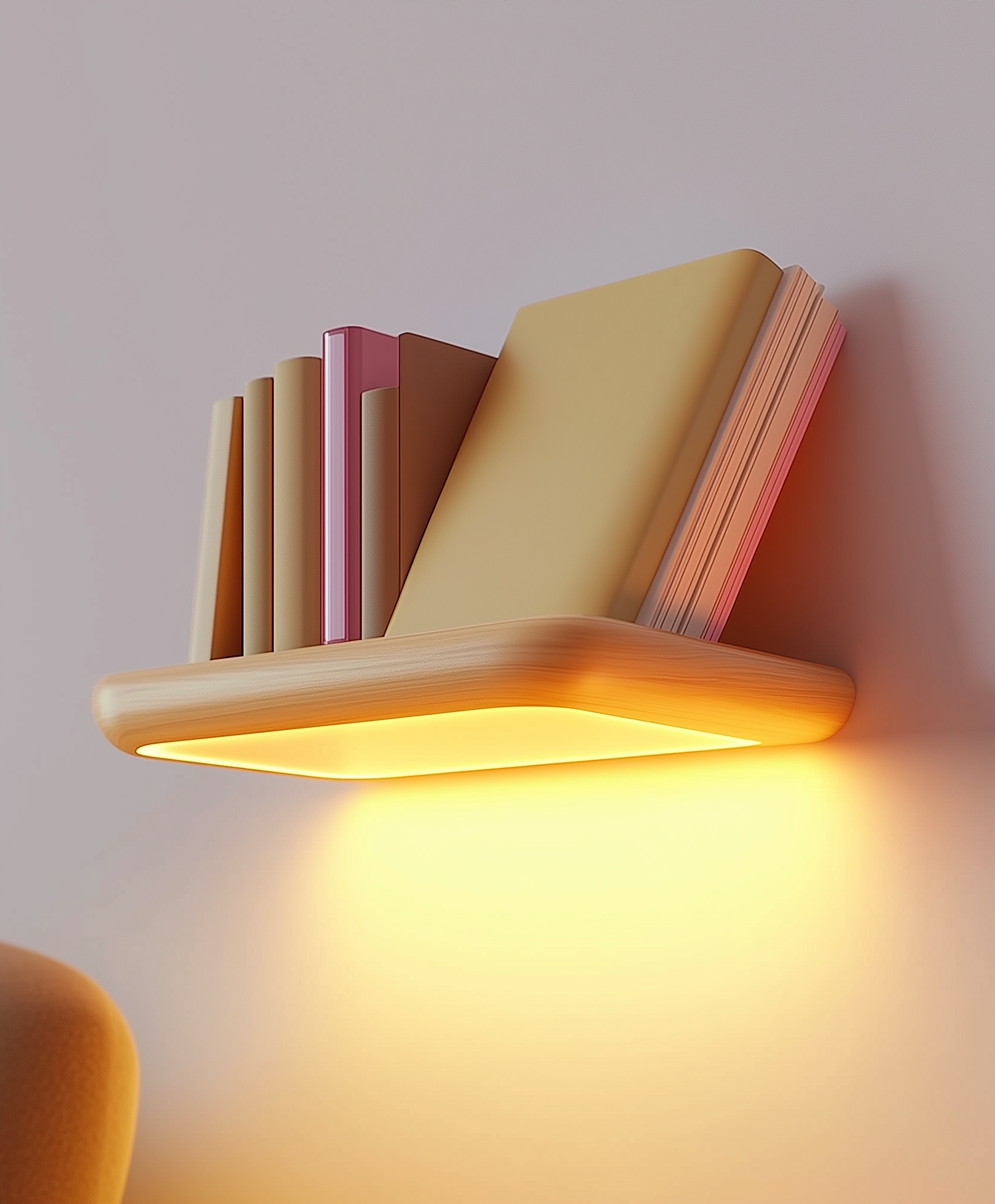 Minimalist wooden wall shelf with books and a warm built-in light, perfect for cozy and functional home decor.