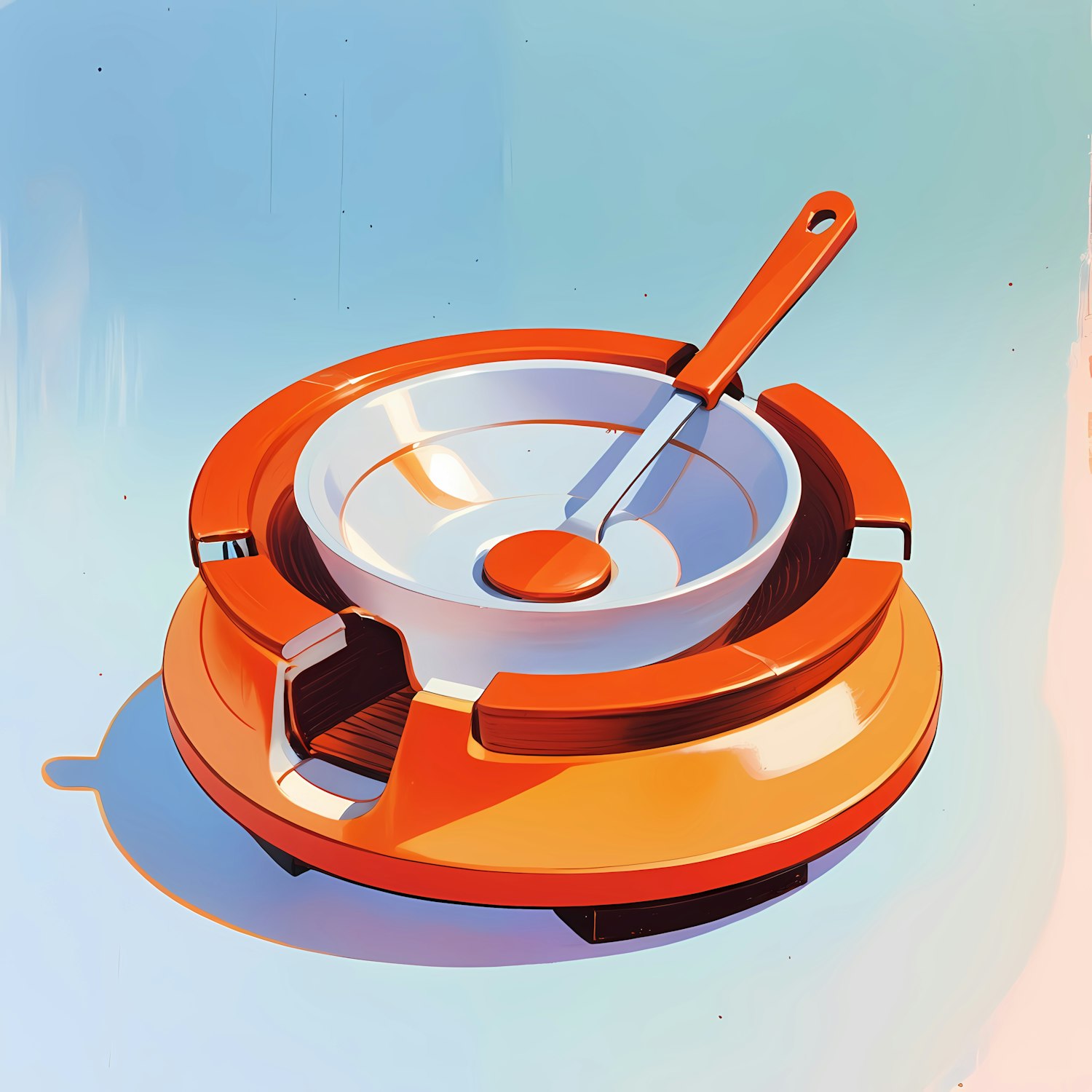 Stylized illustration of a white bowl with an orange spoon on a futuristic orange base, set against a light blue gradient background.