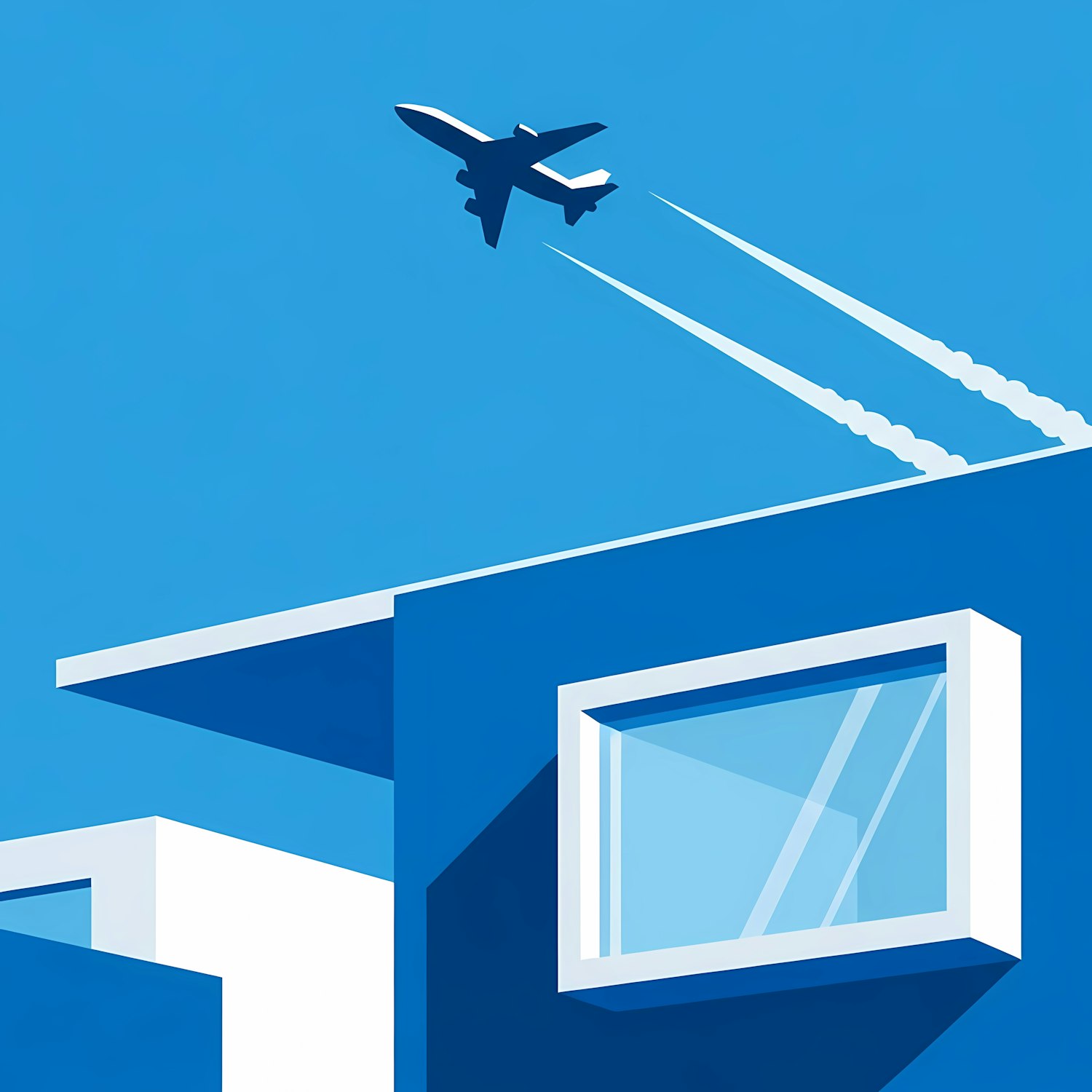 Modern blue building with a large window under a clear sky, as a jet airplane flies overhead leaving contrails.