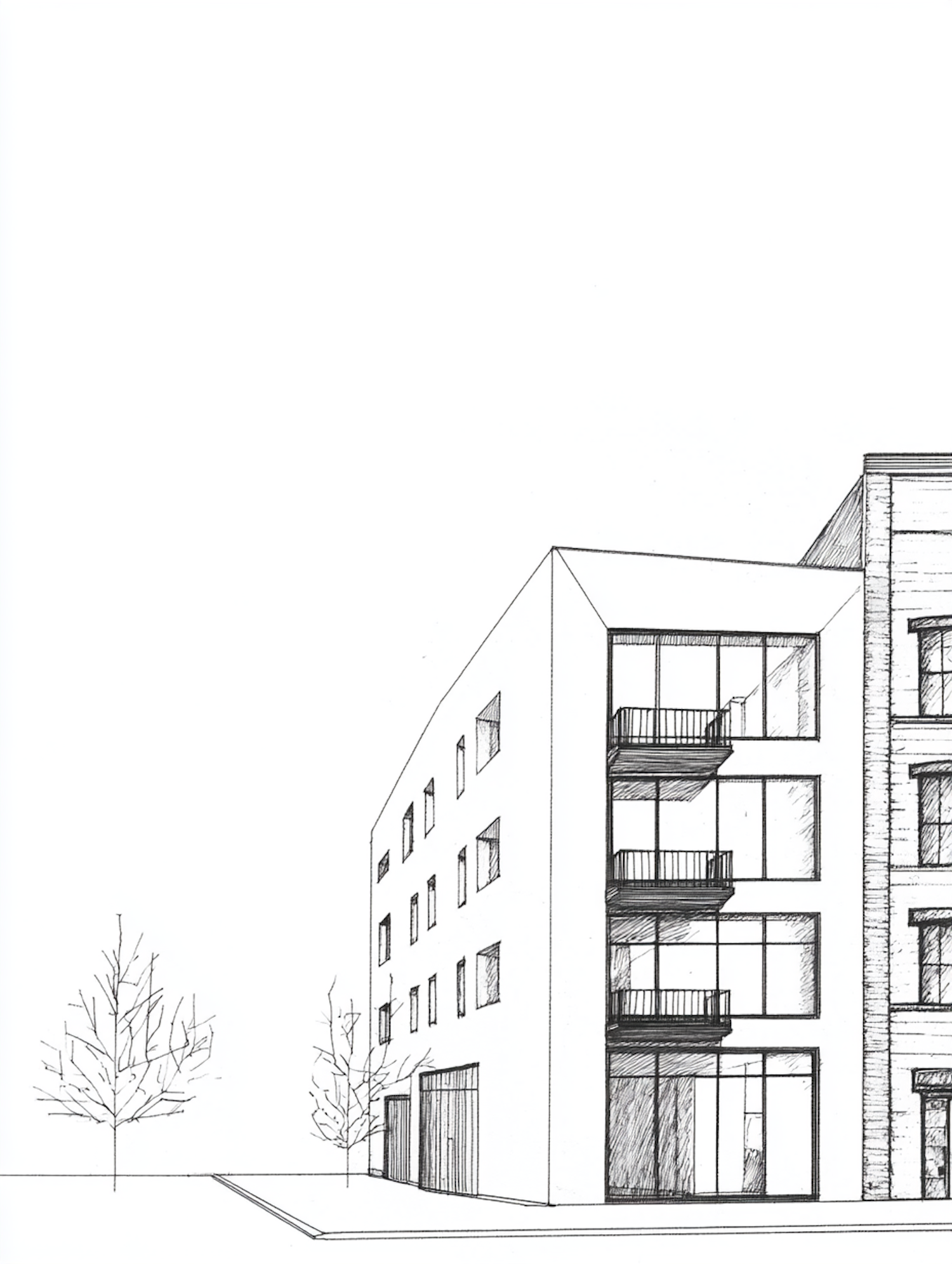 Architectural sketch of a modern building with large windows and balconies, featuring minimalist design and geometric shapes.