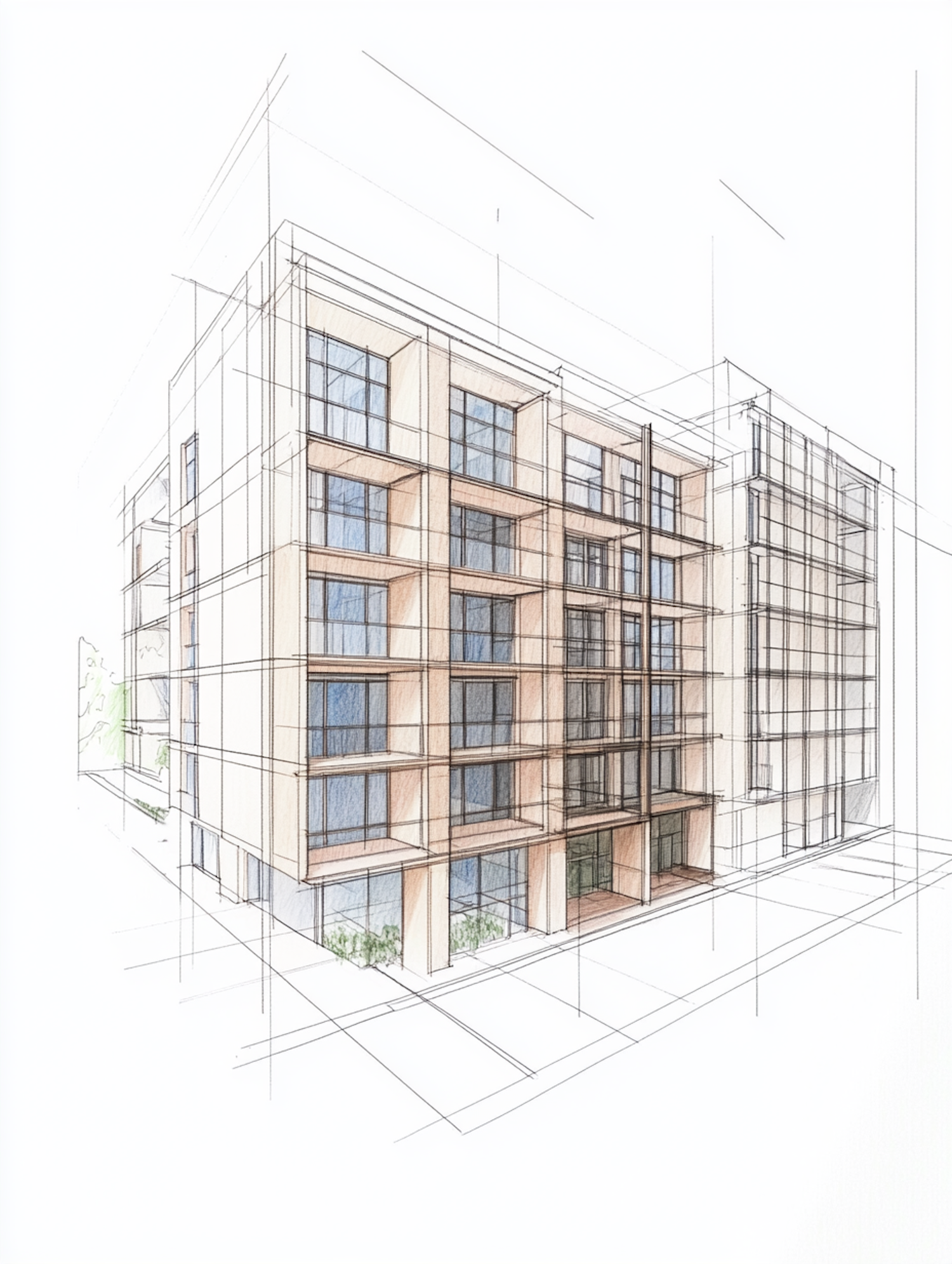 Architectural sketch of a modern building with grid-like facade, large windows, and balconies. Features light brown tones and blue-tinted glass.