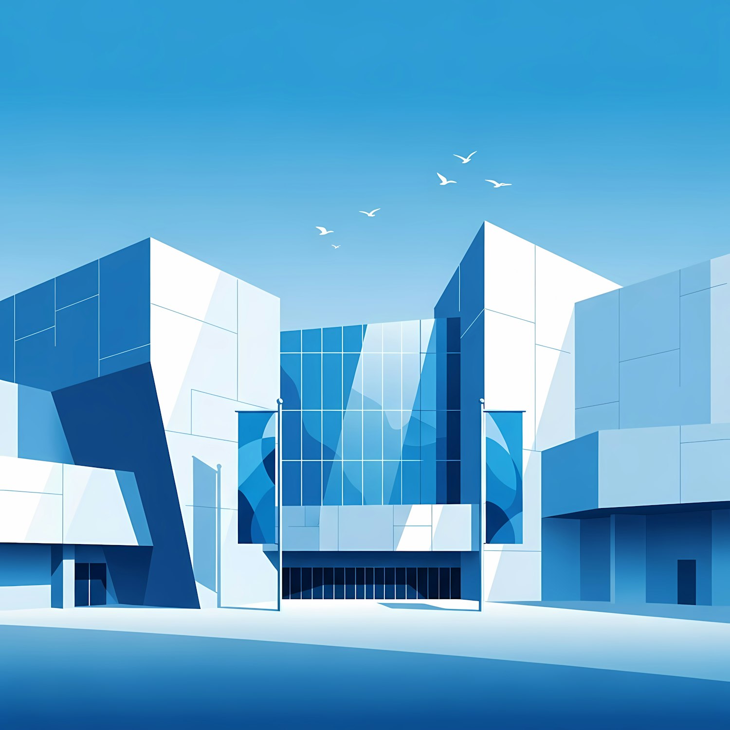 Stylized illustration of a modern building with glass facades, clean lines, and a serene blue color palette under a clear sky.