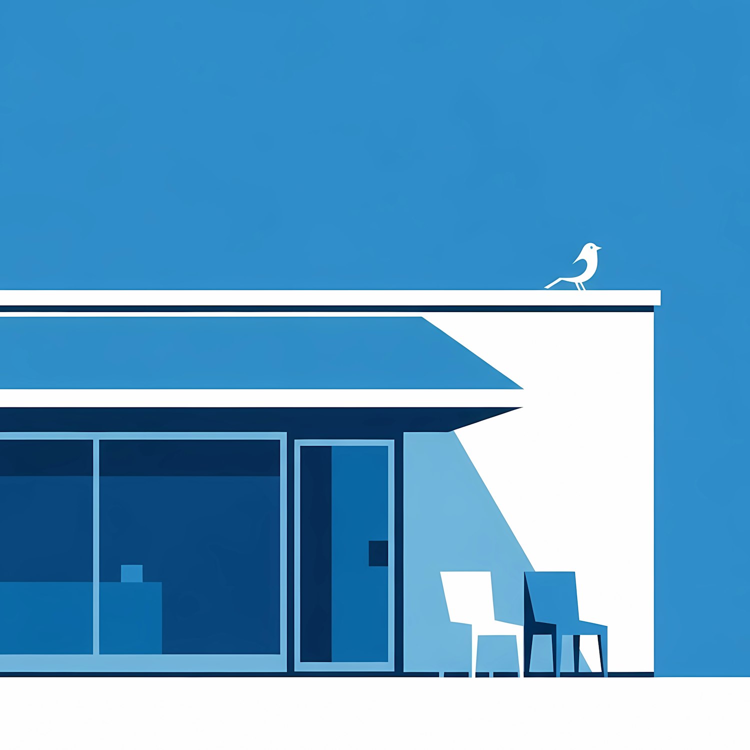 Minimalist illustration of a modern building with a bird on the roof, blue tones, and clean lines. Perfect for contemporary design lovers.