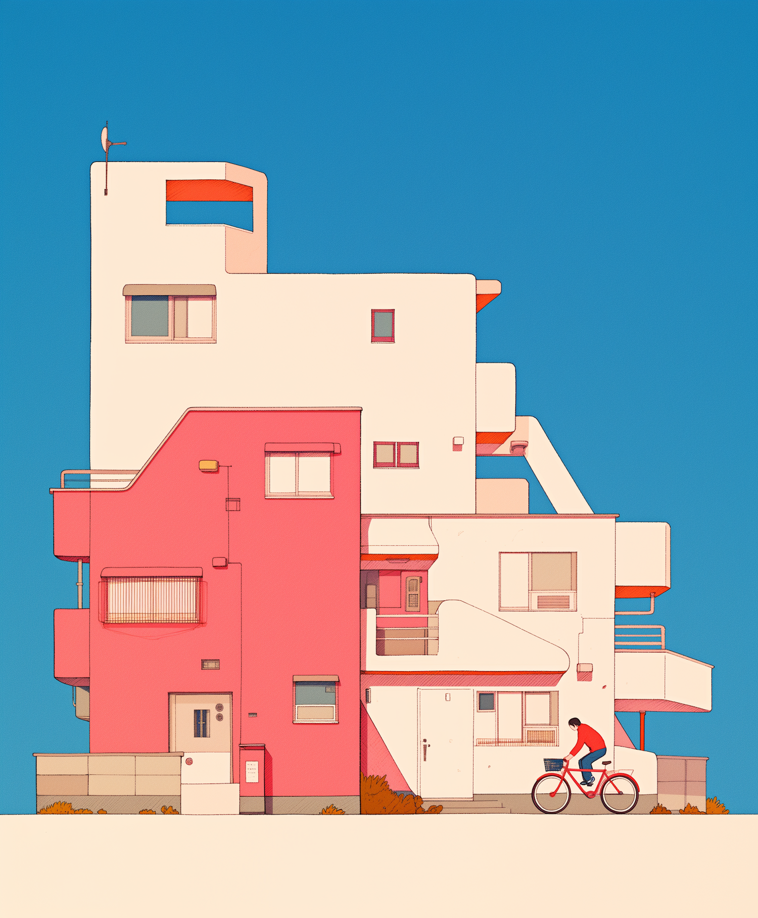 Modern geometric building with pink and white facades, cyclist in red shirt, blue sky. Minimalist design, vibrant colors.