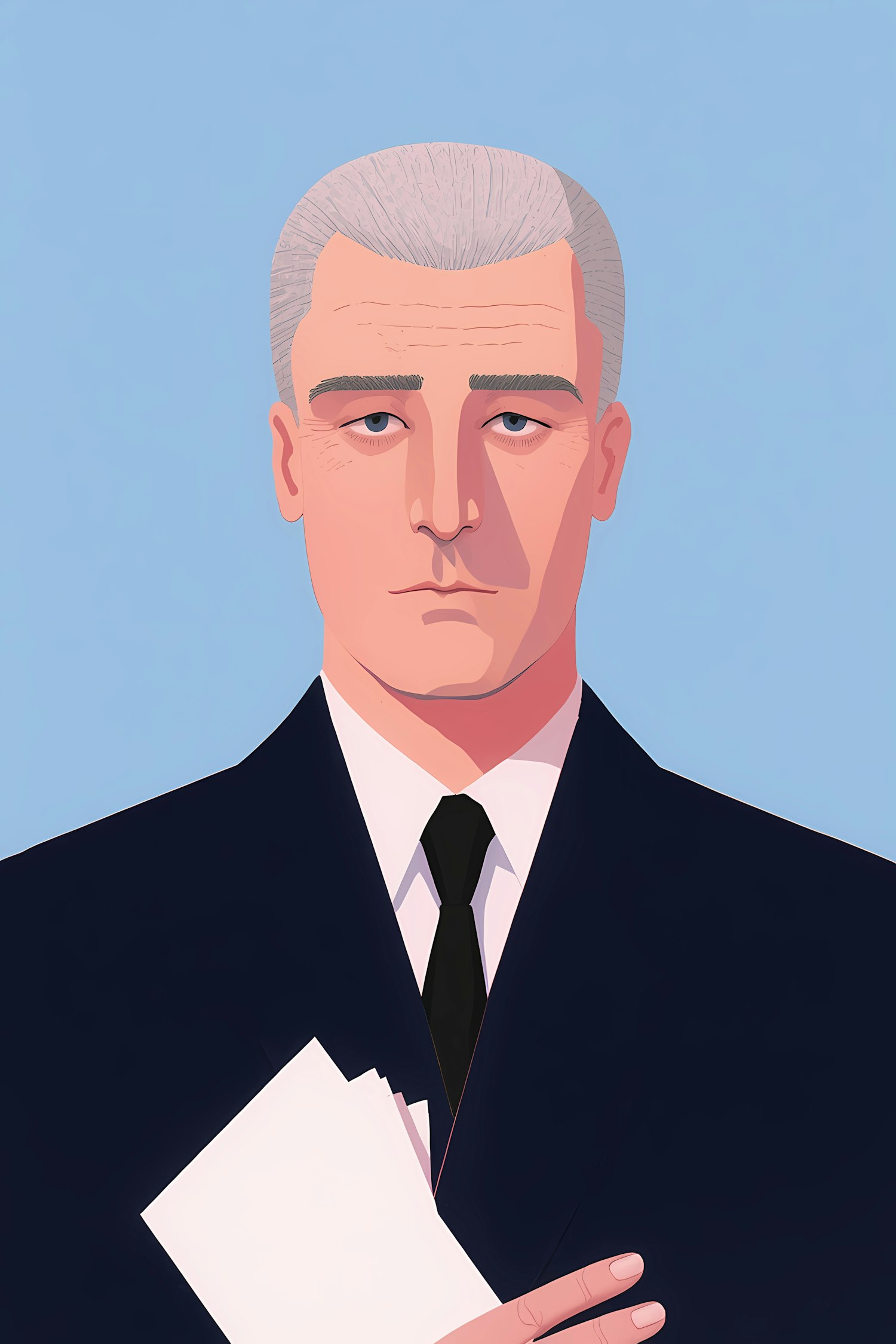 Stylized illustration of a man in a suit holding papers, set against a light blue background, with clean lines and modern design.