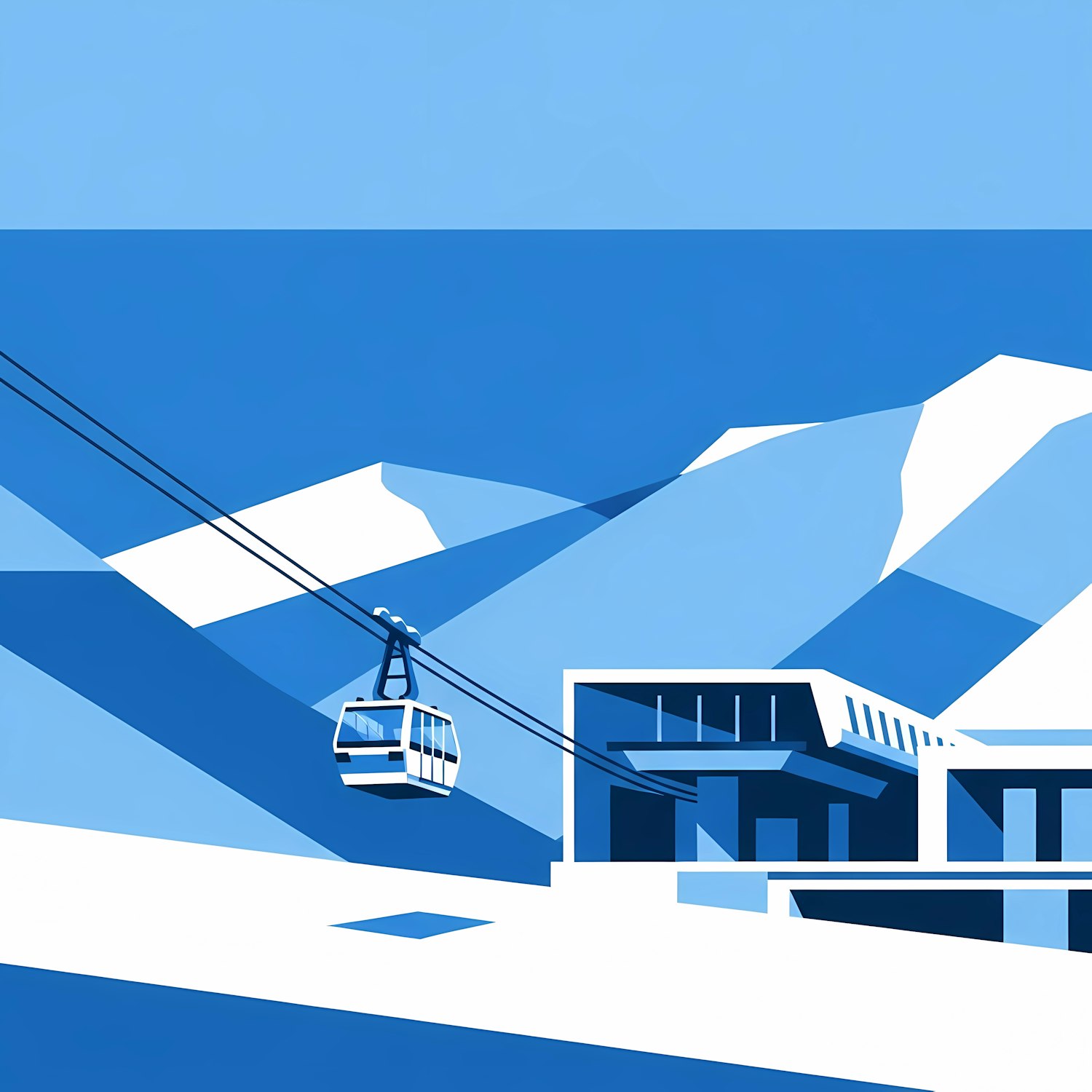 Stylized blue and white illustration of a cable car station in a mountainous landscape, featuring modern architecture and abstract peaks.