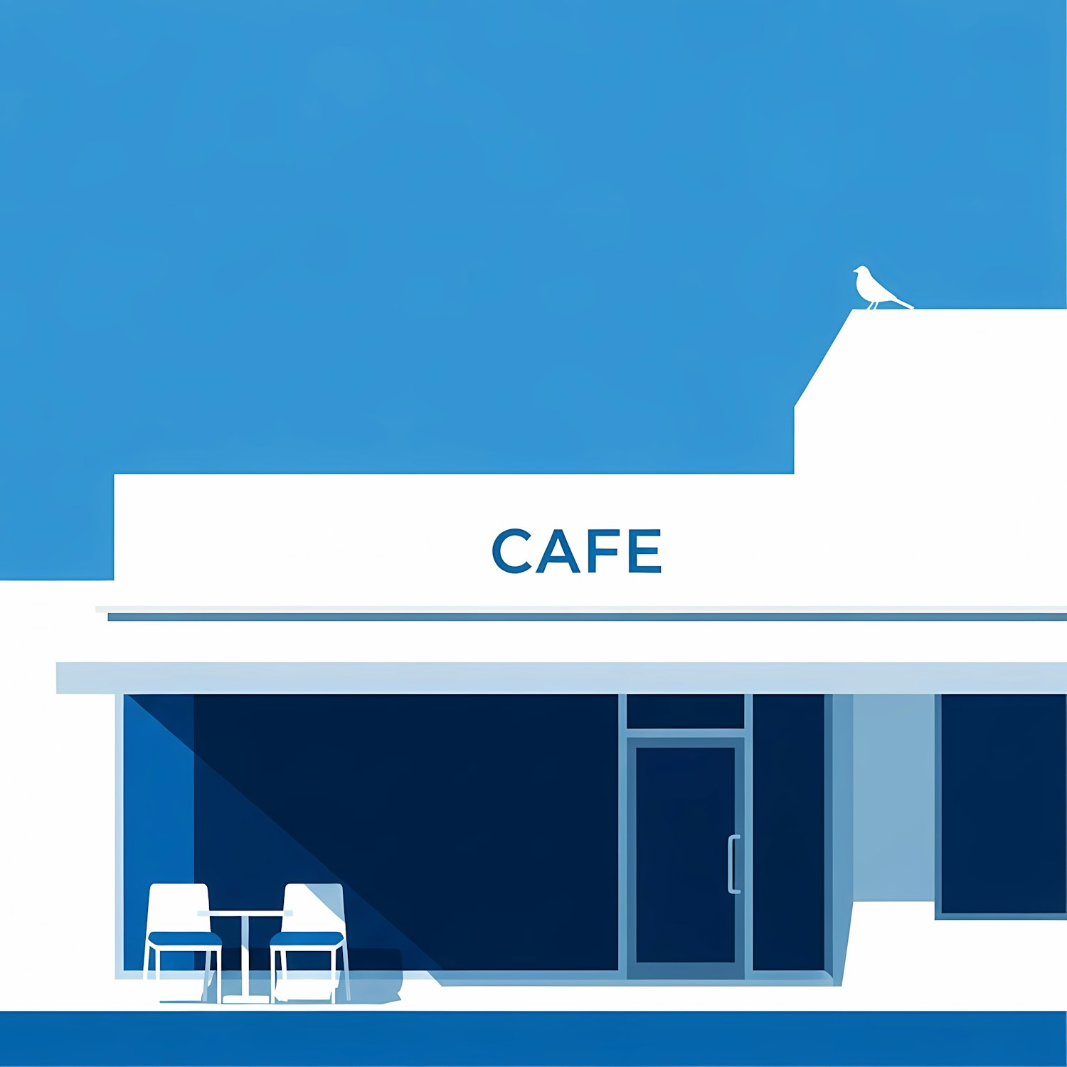 Minimalist illustration of a modern cafe with outdoor seating, a bird on the roof, and a clean blue and white color scheme.