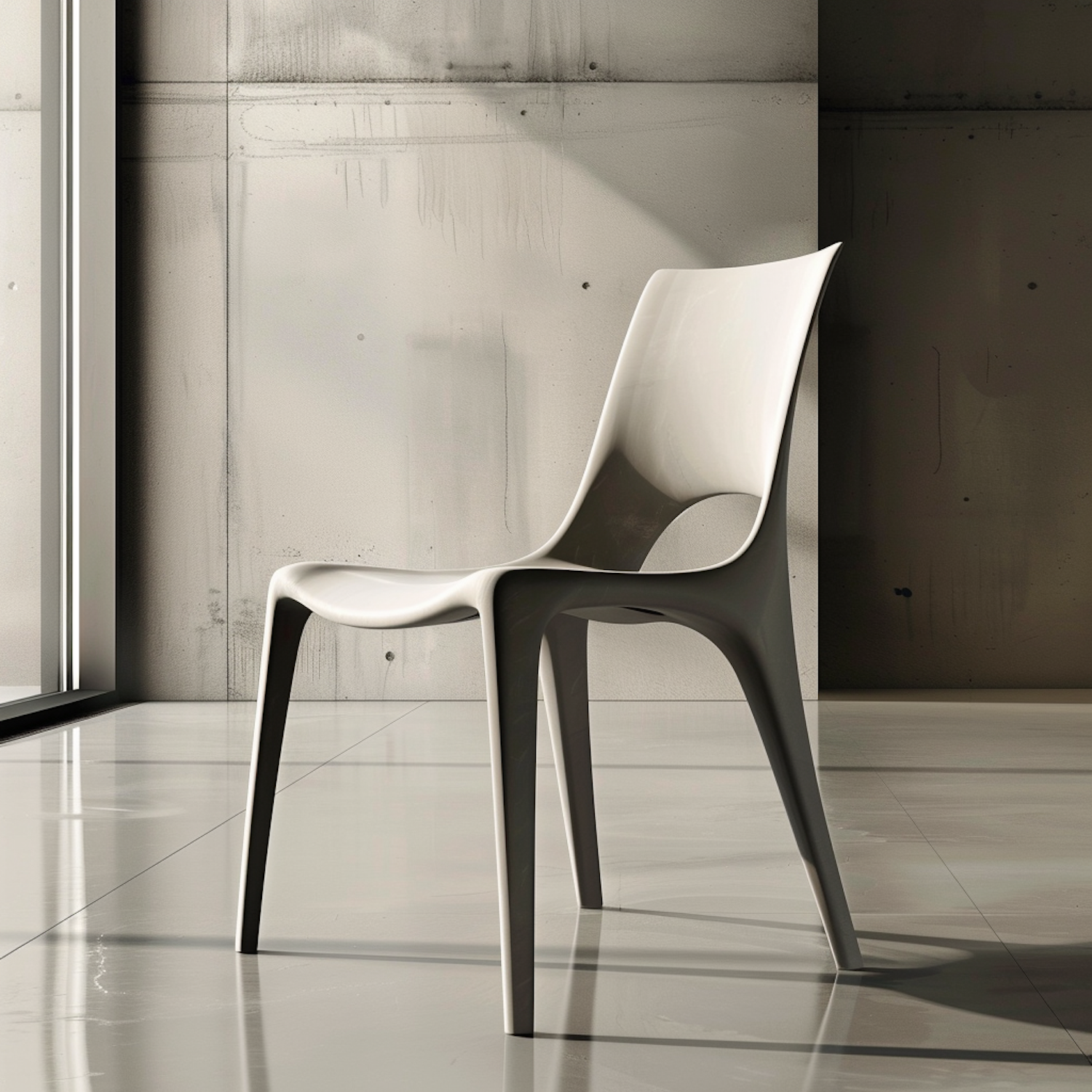 Sleek modern chair in a minimalist room with concrete walls and polished floors, bathed in soft natural light.