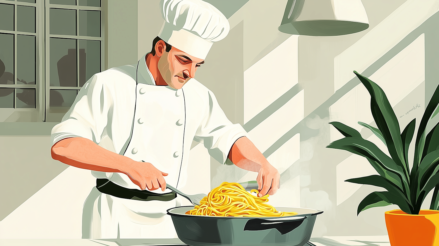 Illustration of a chef cooking spaghetti in a bright kitchen with sunlight and a potted plant.
