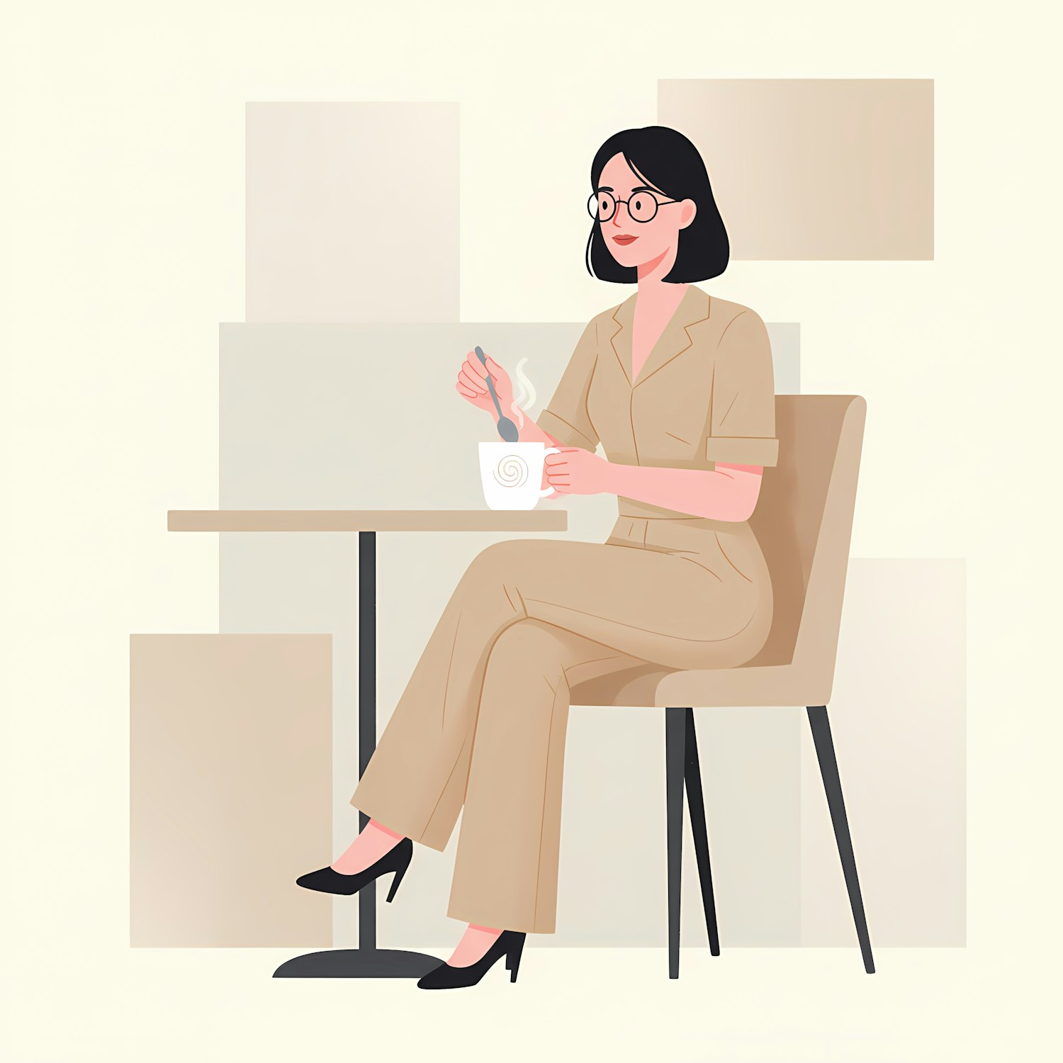 Illustration of a woman in a beige jumpsuit enjoying coffee in a minimalist setting, with a modern and clean aesthetic.