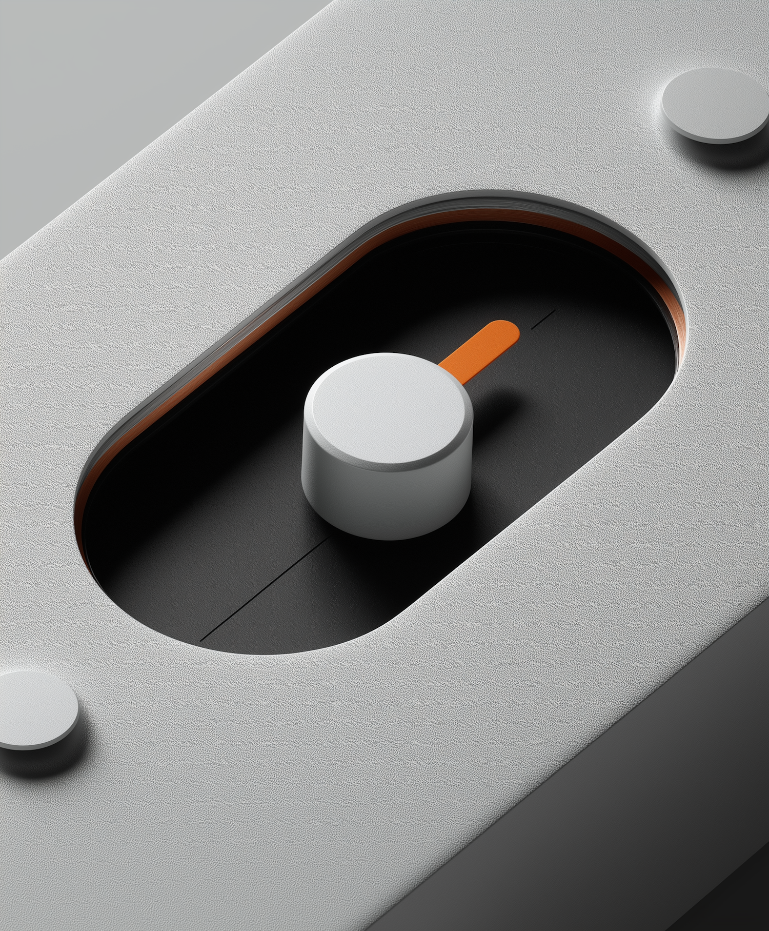 Minimalist control knob on a textured gray surface with an orange accent, blending sleek design and functionality.