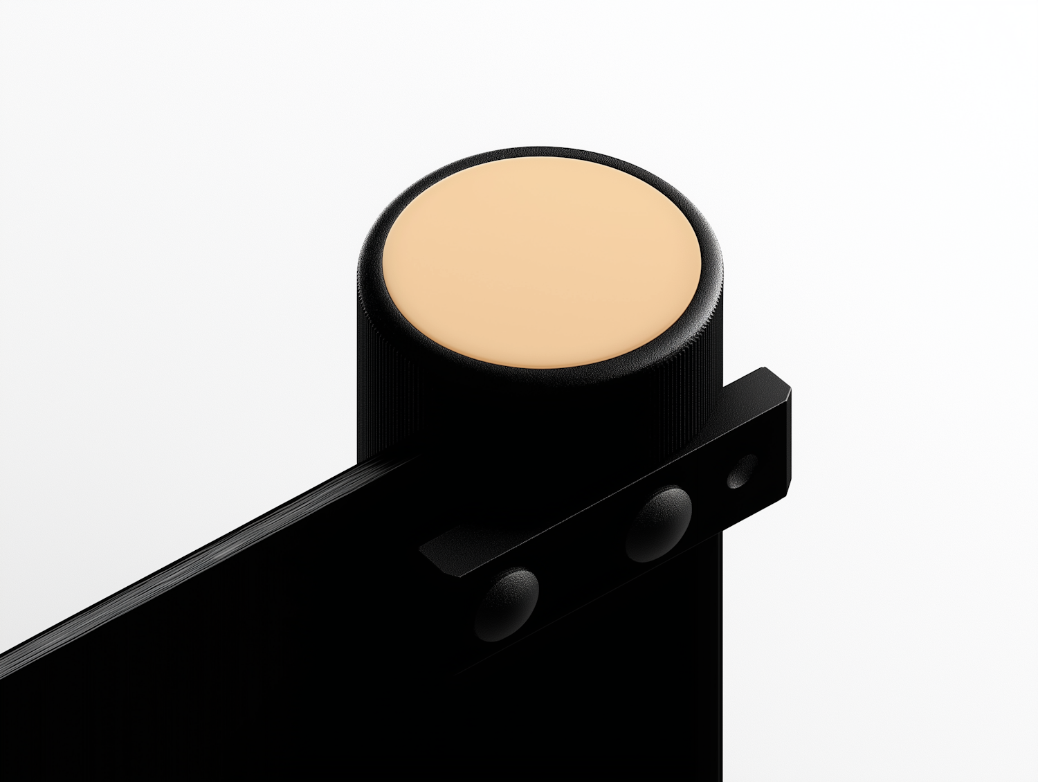 Minimalist black structure with a beige-topped cylindrical knob and circular indents, set against a clean white background.