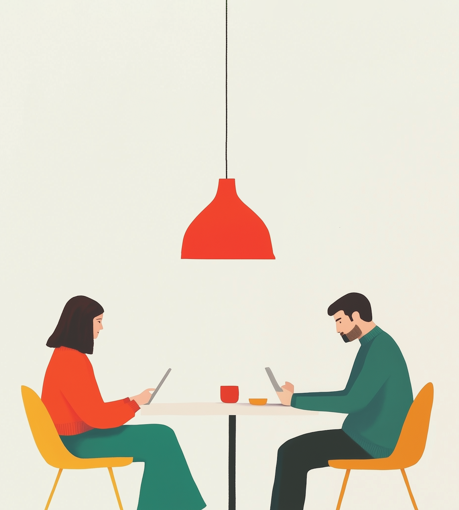 Minimalist illustration of a man and woman using tablets at a table, under a red lamp. Bright colors and simple design.