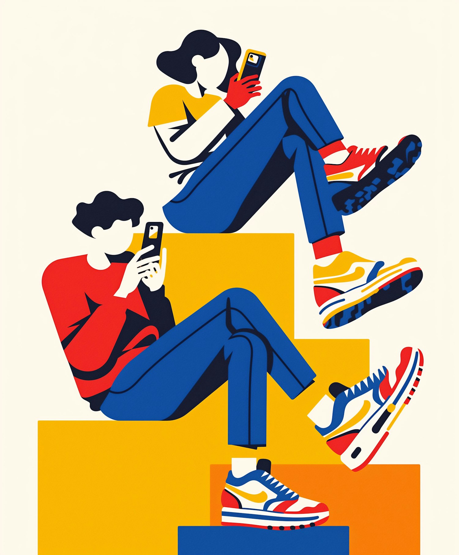 Abstract illustration of two figures on phones, dressed in vibrant colors, sitting on geometric blocks. Modern digital engagement theme.