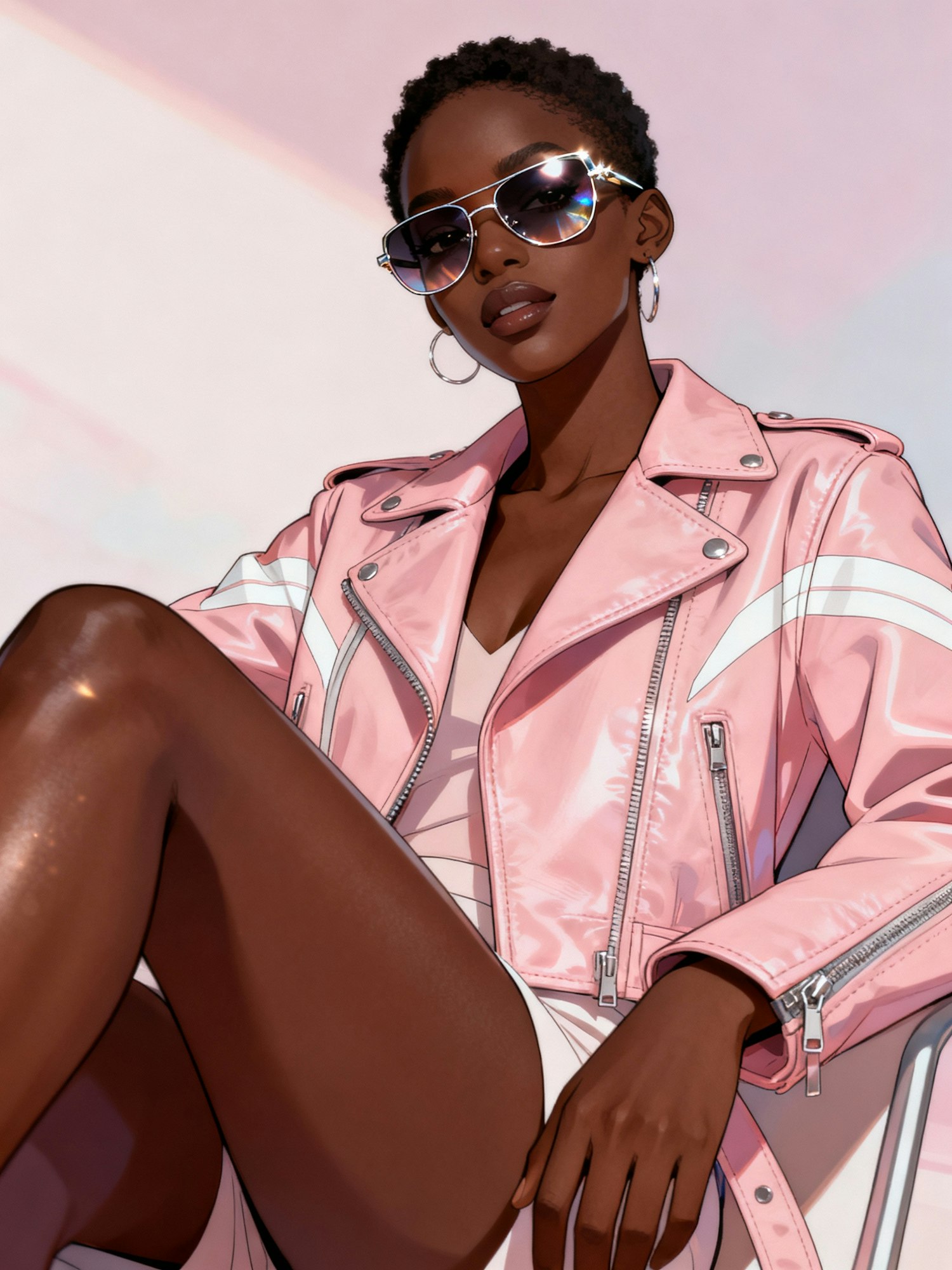 High-definition, cinematic portrait of a stylish Black female wearing a sleek baby-pink leather jacket with subtle white accents, paired with sunglasses. She is seated confidently against a complementary background, with soft, directional lighting highlighting the jacket’s texture, the metallic sheen of the sunglasses, and her glowing skin. Her posture is relaxed yet commanding, exuding modern, edgy style. Fashion-forward, sophisticated, and visually striking—perfect for an editorial or high-fashion portrait.
