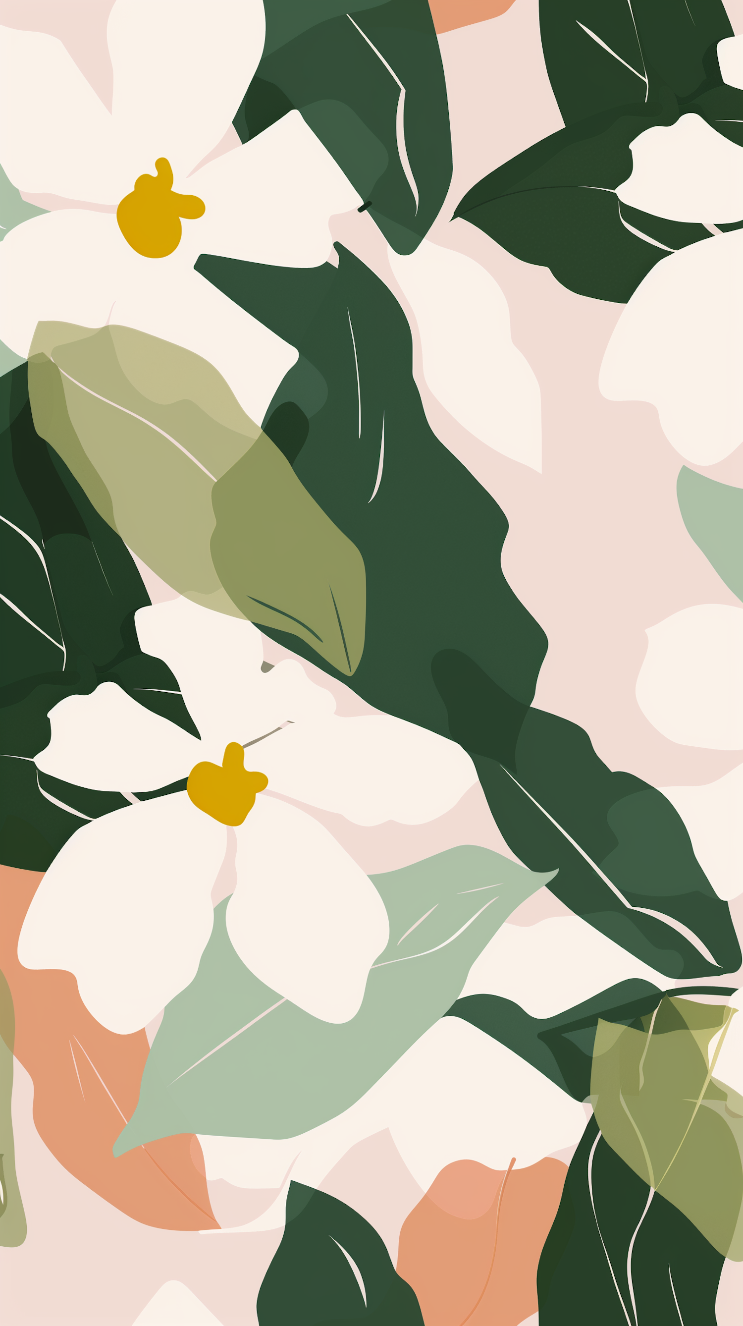 Modern floral illustration with white flowers, green leaves, and a soft beige background accented by peach and light green tones.