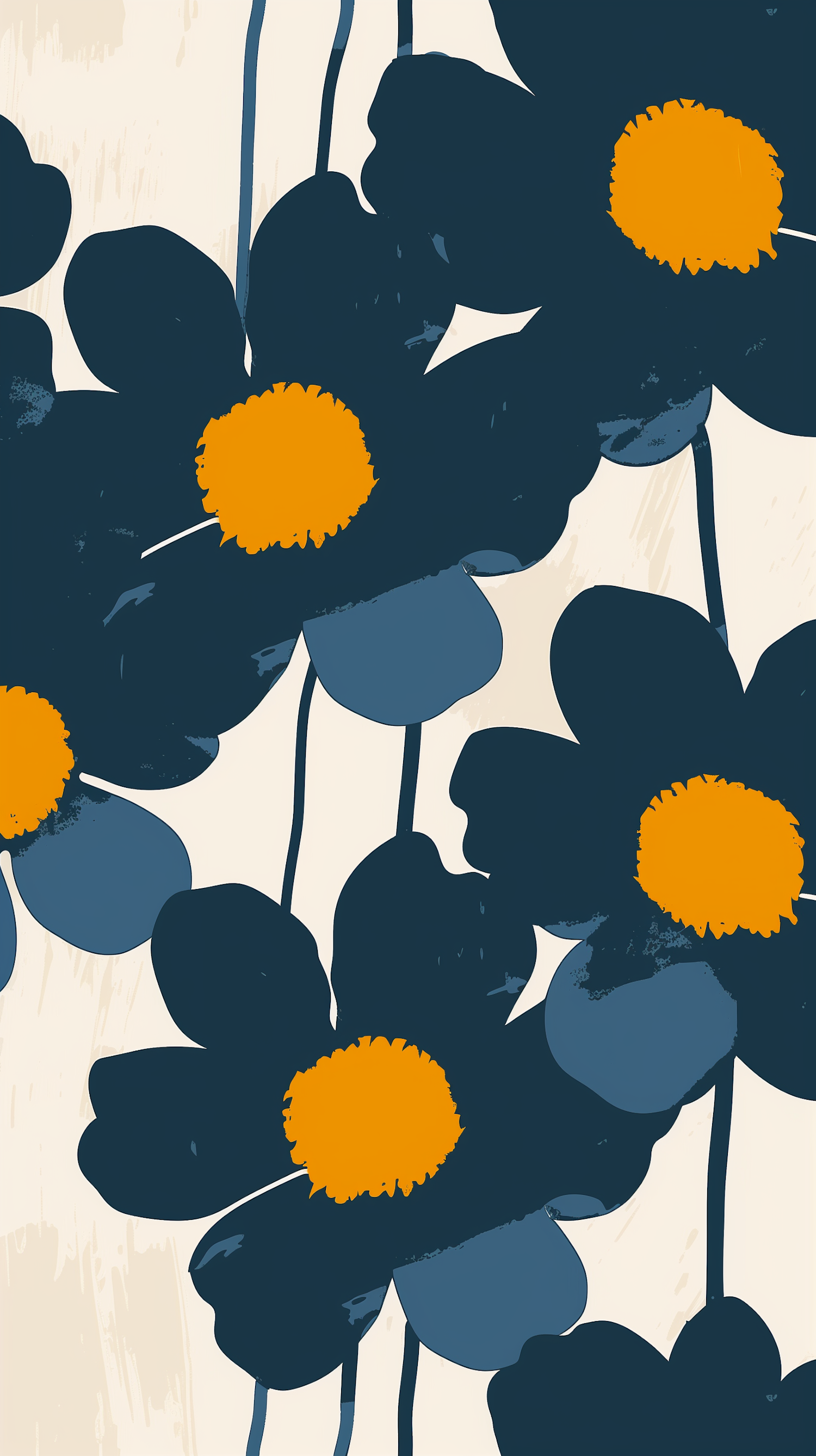 Modern floral illustration with dark blue petals, orange centers, and a beige textured background. Bold and artistic design.