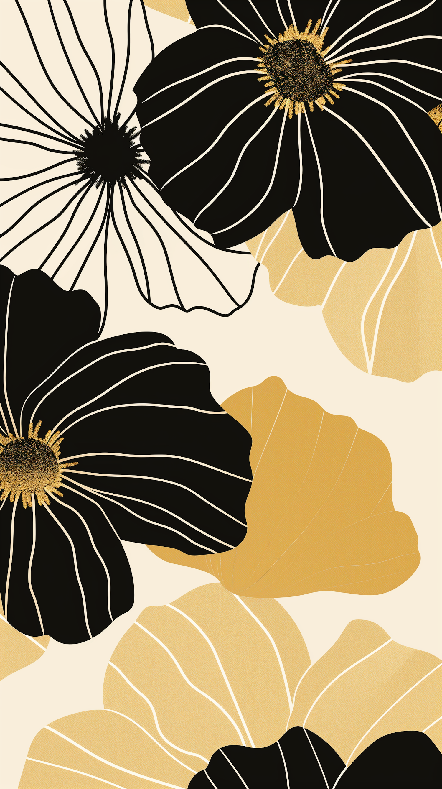 Bold black and gold floral illustration with white outlines on a beige background, perfect for modern and minimalistic decor.