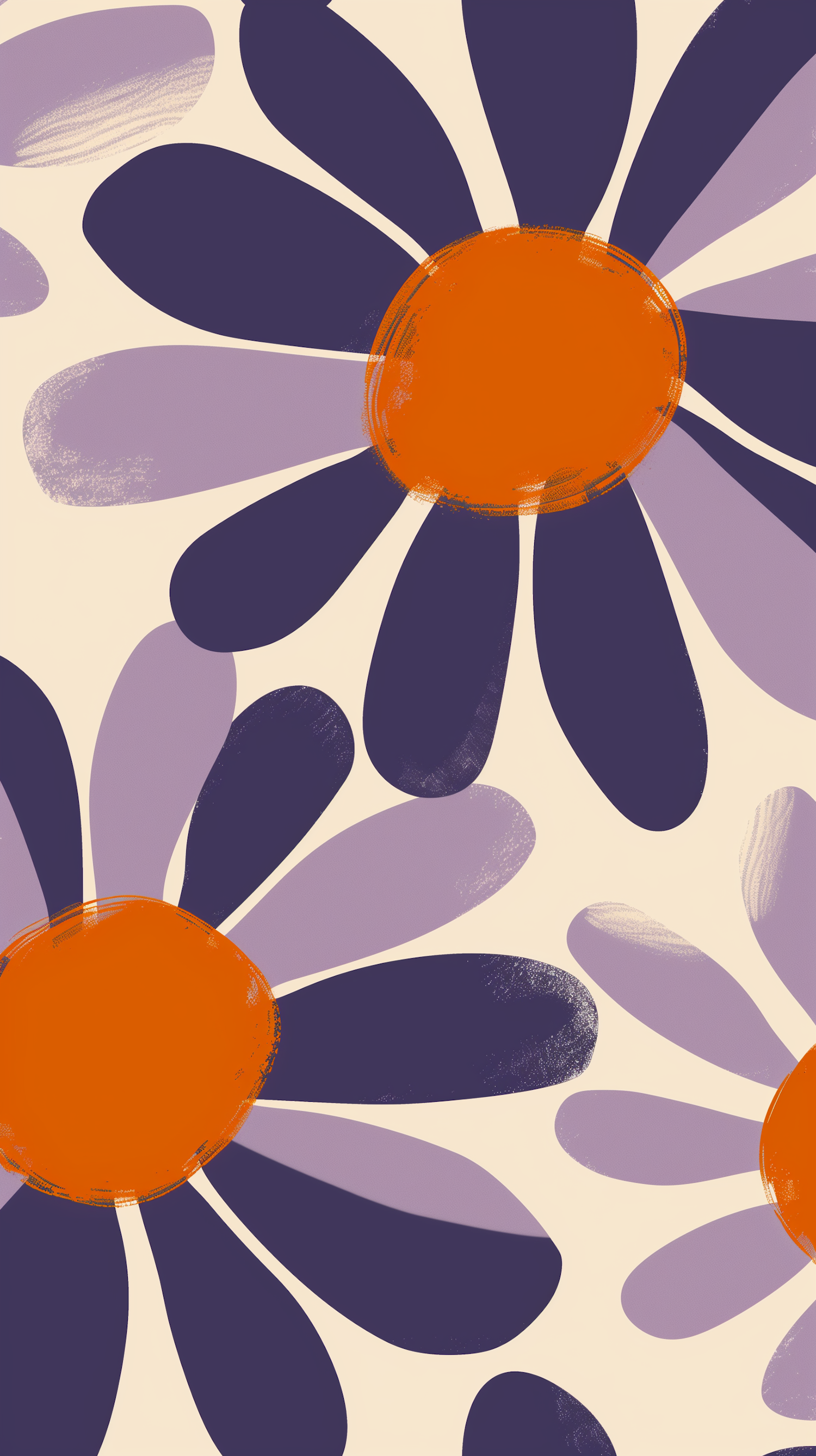 Bold floral illustration with purple petals, orange centers, and a cream background. Retro-inspired, perfect for modern decor or design.