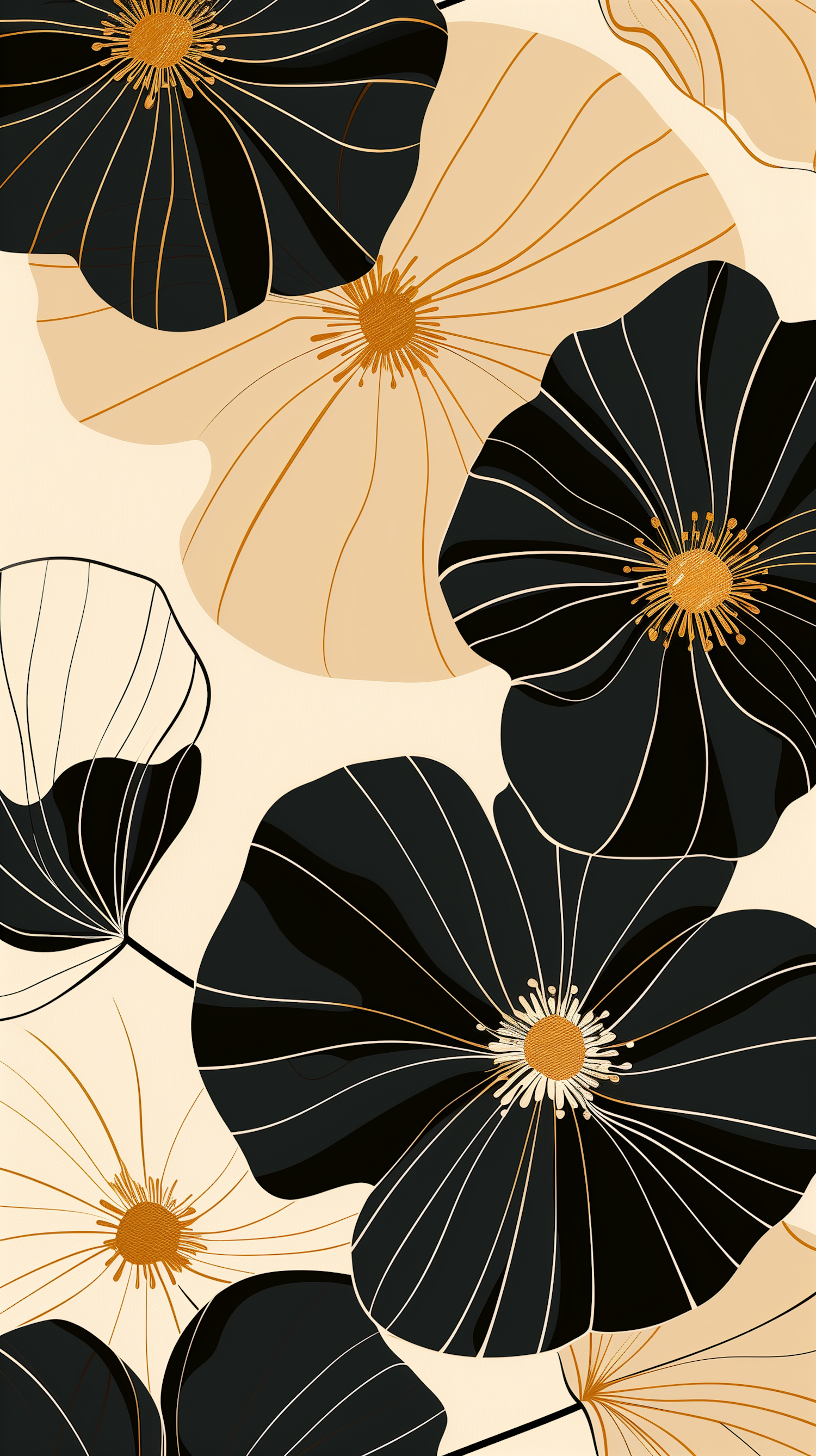 Minimalist floral illustration with bold black and beige flowers, golden accents, and elegant linework on a soft beige background.