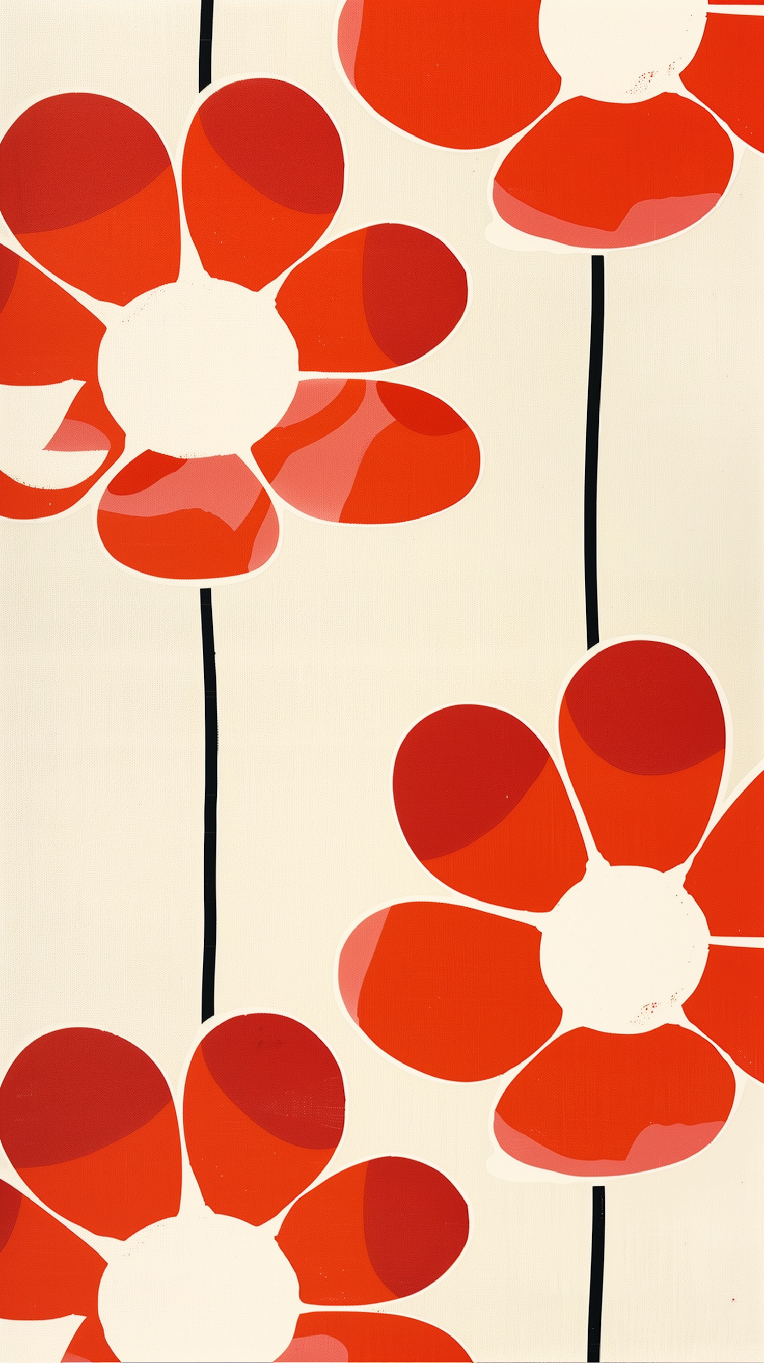 Bold red flowers with black stems on a beige background create a retro-inspired, modern floral pattern with vibrant tones.