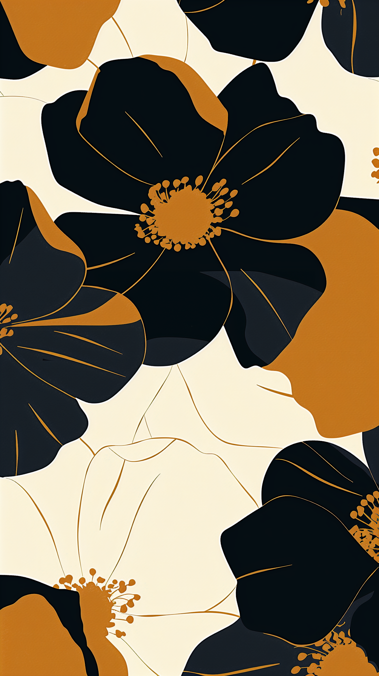 Modern floral pattern with bold black and mustard yellow flowers on a beige background, perfect for textiles or graphic design.